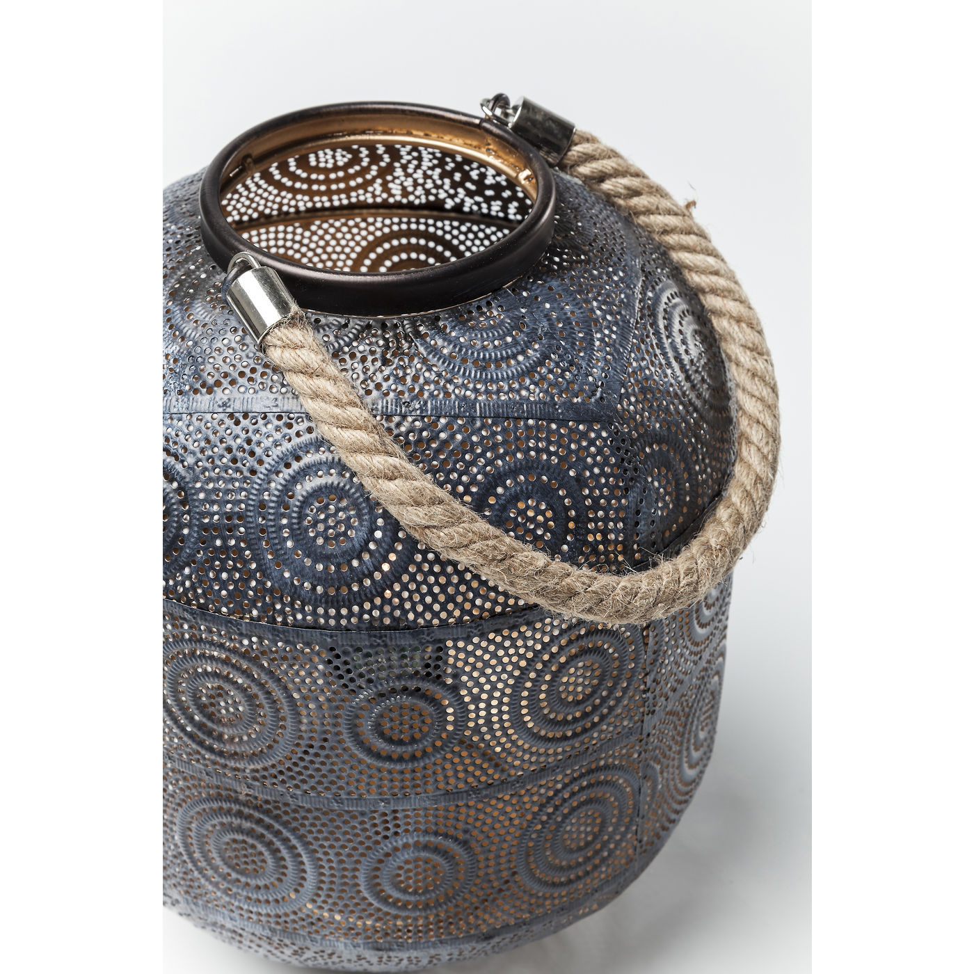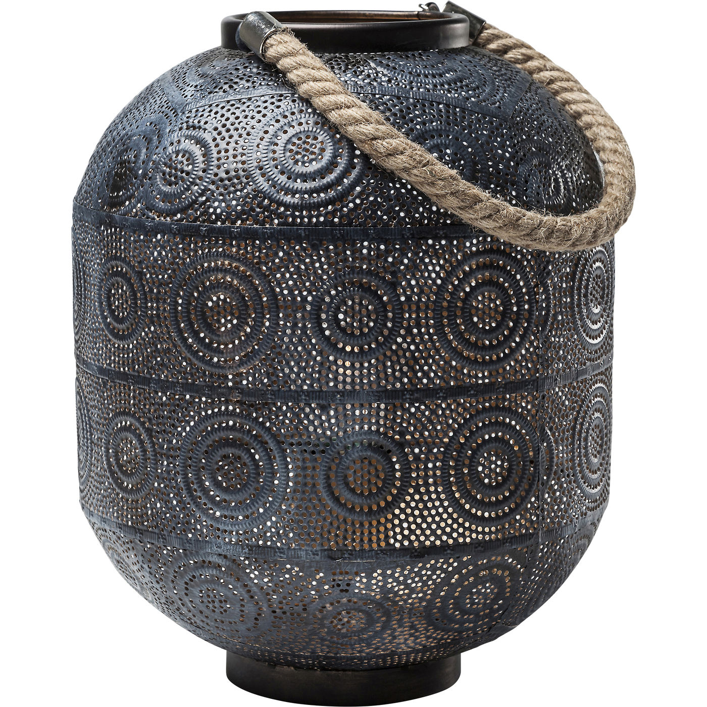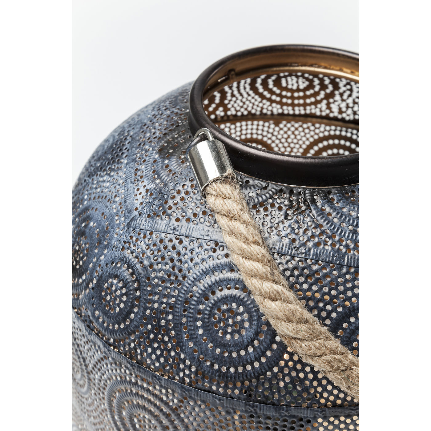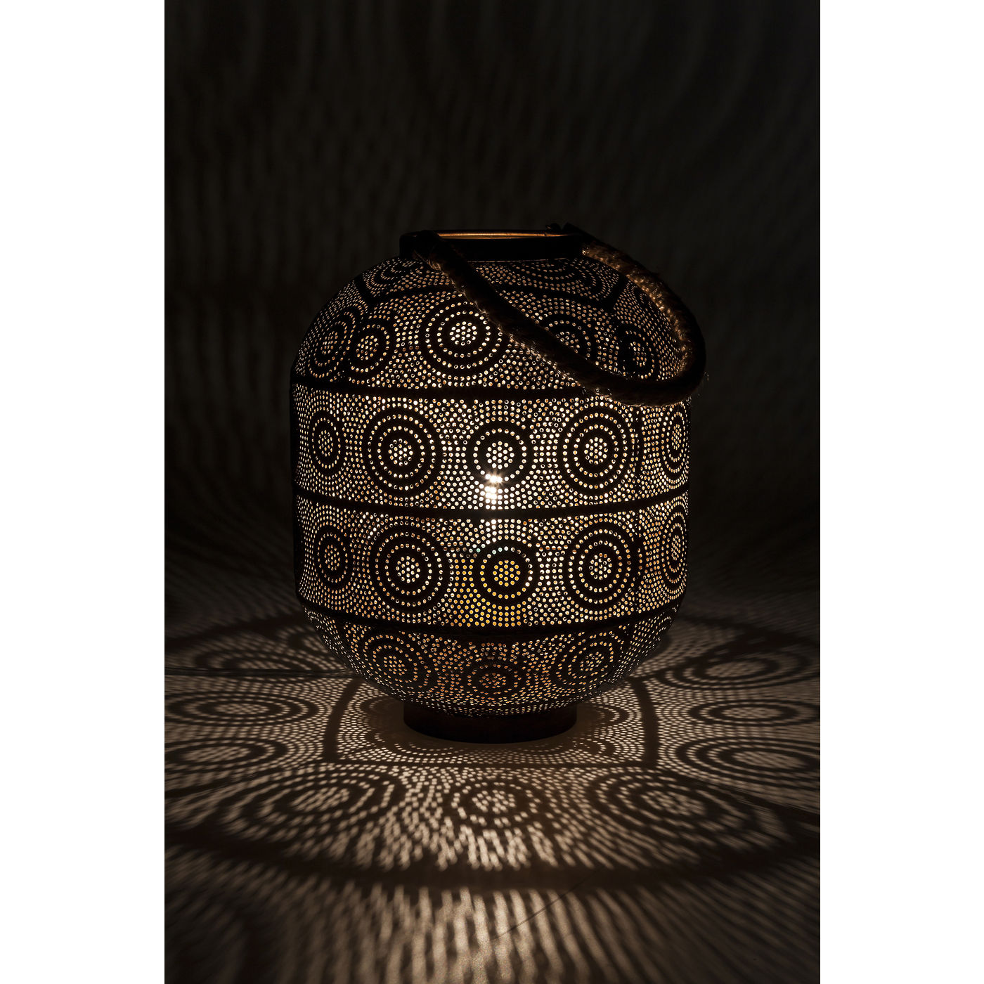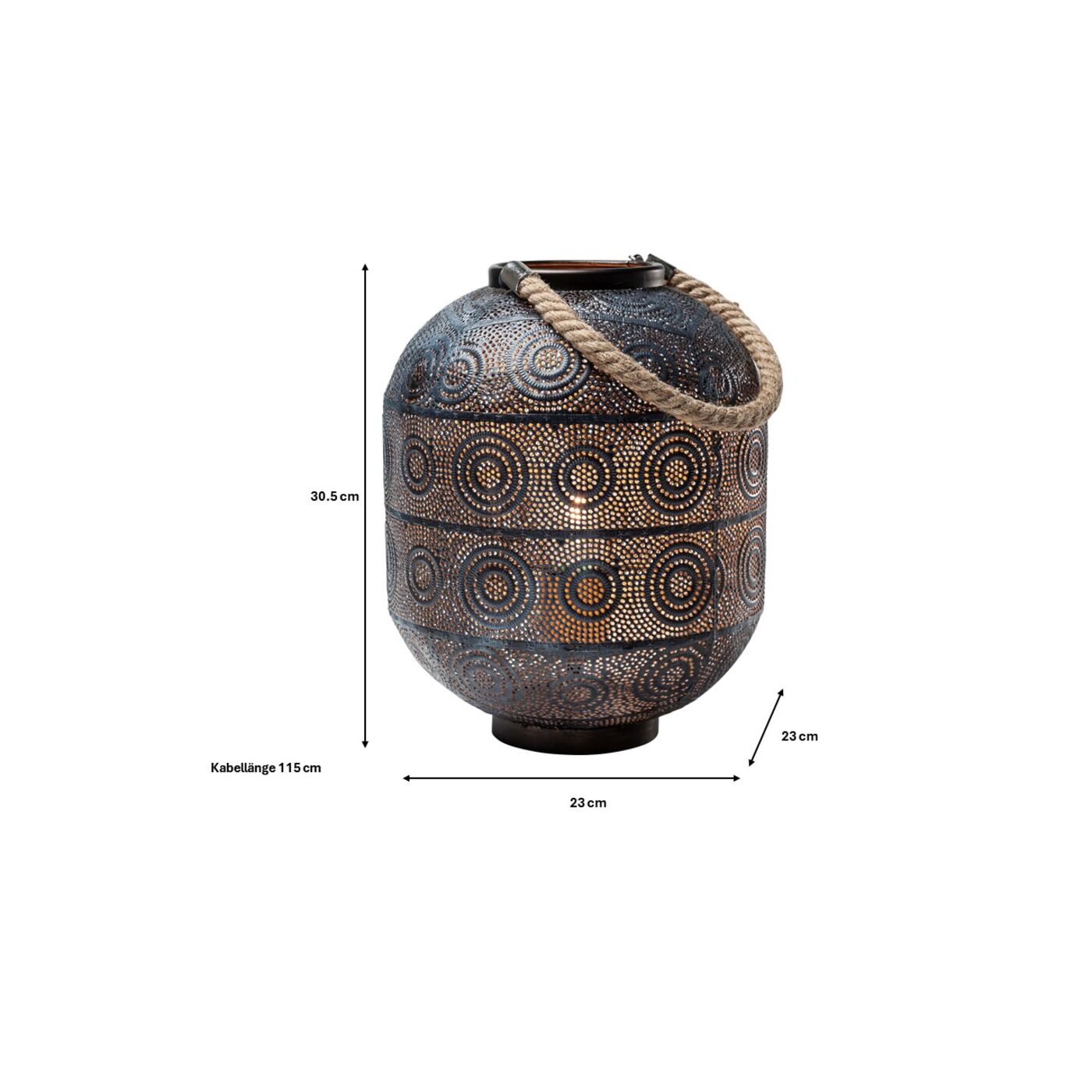 The oriental-style floor lamp conjures up a beautiful, iridescent play of light in the room. A perforated pattern blends into expressive ornaments that create a pleasant atmosphere. The design is based on that of a typical oriental lantern. With a height of 30 cm, this attractive lamp knows how to set the scene. 230 V, 50/60 Hz, bulb fitting E27, number of illuminant 1, max. 40 watt, without illuminant, replacable illuminant
