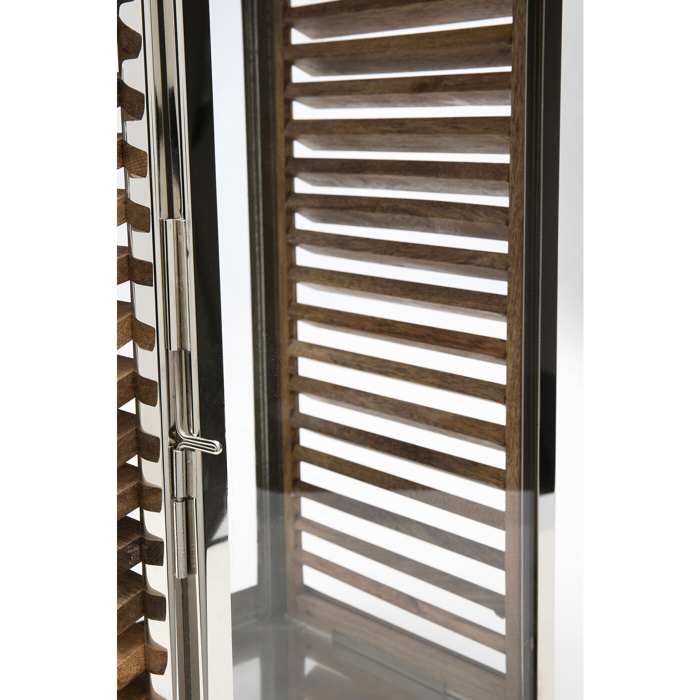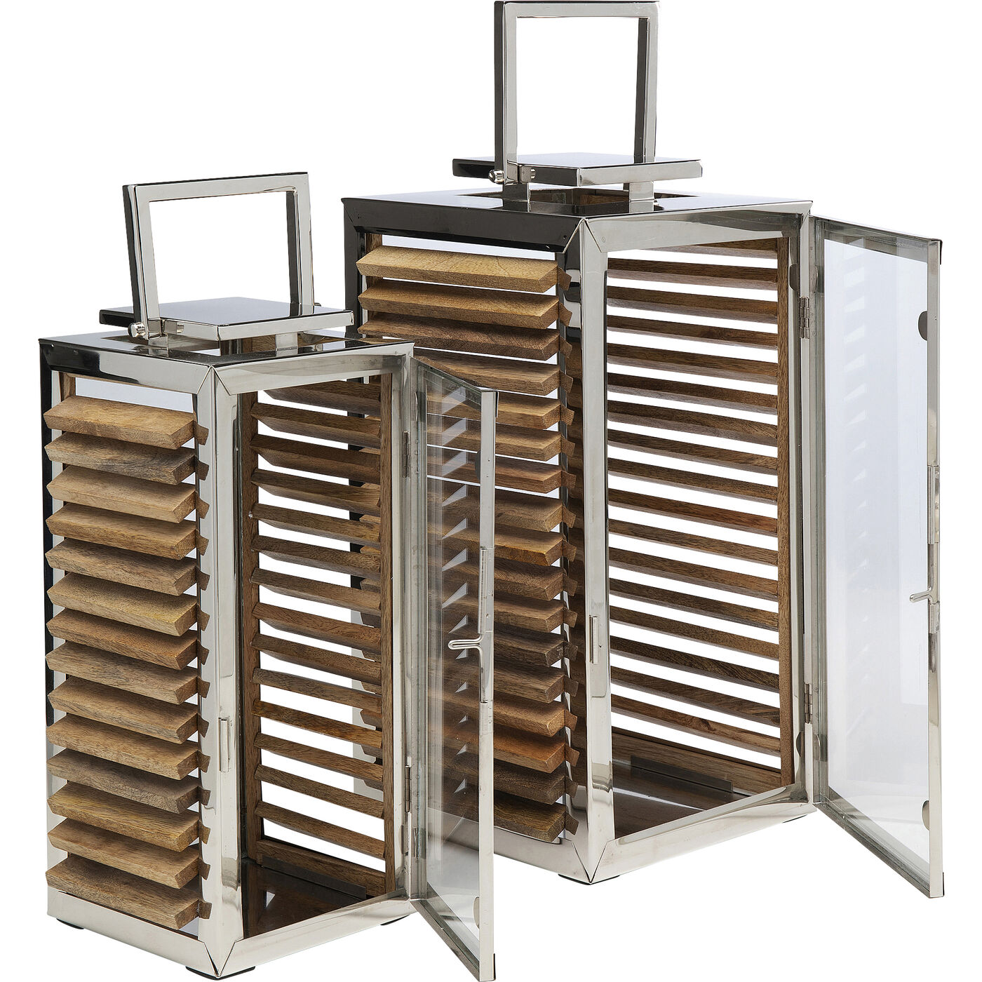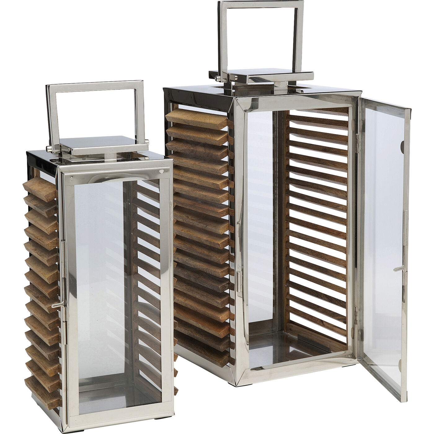 Our set of 2 lanterns adds a special touch to your home. The silver-colored components made of nickel-plated, shiny stainless steel look elegant. The wooden sides of the candle holders create a natural ambience. The design and the mix of materials create a warm atmosphere and bring light into every corner. Made with high-quality materials, these lanterns make for a stylish decoration. Place them indoors or outdoors for charming lighting and an upscale touch. Outdoors, please protect these lanterns from moisture and splashing water.