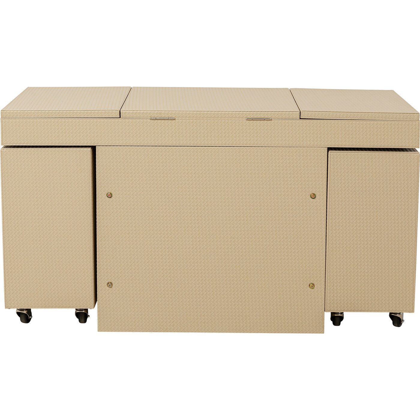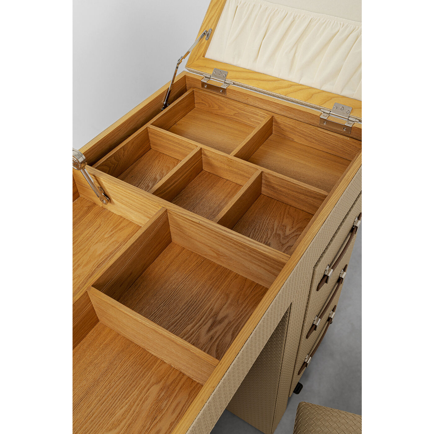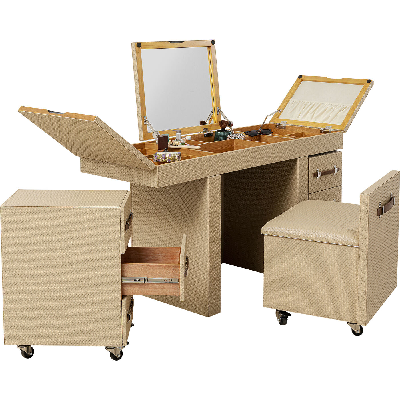 Give your make-up area a new dimension with this mobile dressing table in the warm colour of beige. The elegant dressing table features numerous, functional details. It is sturdily made of medium-density fibreboard covered with a chic wicker-look cover. Other details are created with ash veneer. The dressing table combination is mounted on steel casters so you can move it around easily. This dressing table has its own stool (56x5x46x57cm) which fits completely under the table. There are also two mobile containers with drawers, as well as numerous compartments in the table top to store your makeup and beauty products and other cosmetic utensils in a functional and well-protected way. The surface of the dressing table makes an impact with a classy wicker look, while the easy-care cover made of coated fabric ensures that your will always look as good as new. Be inspired by this dressing table and put on your make-up like a star!