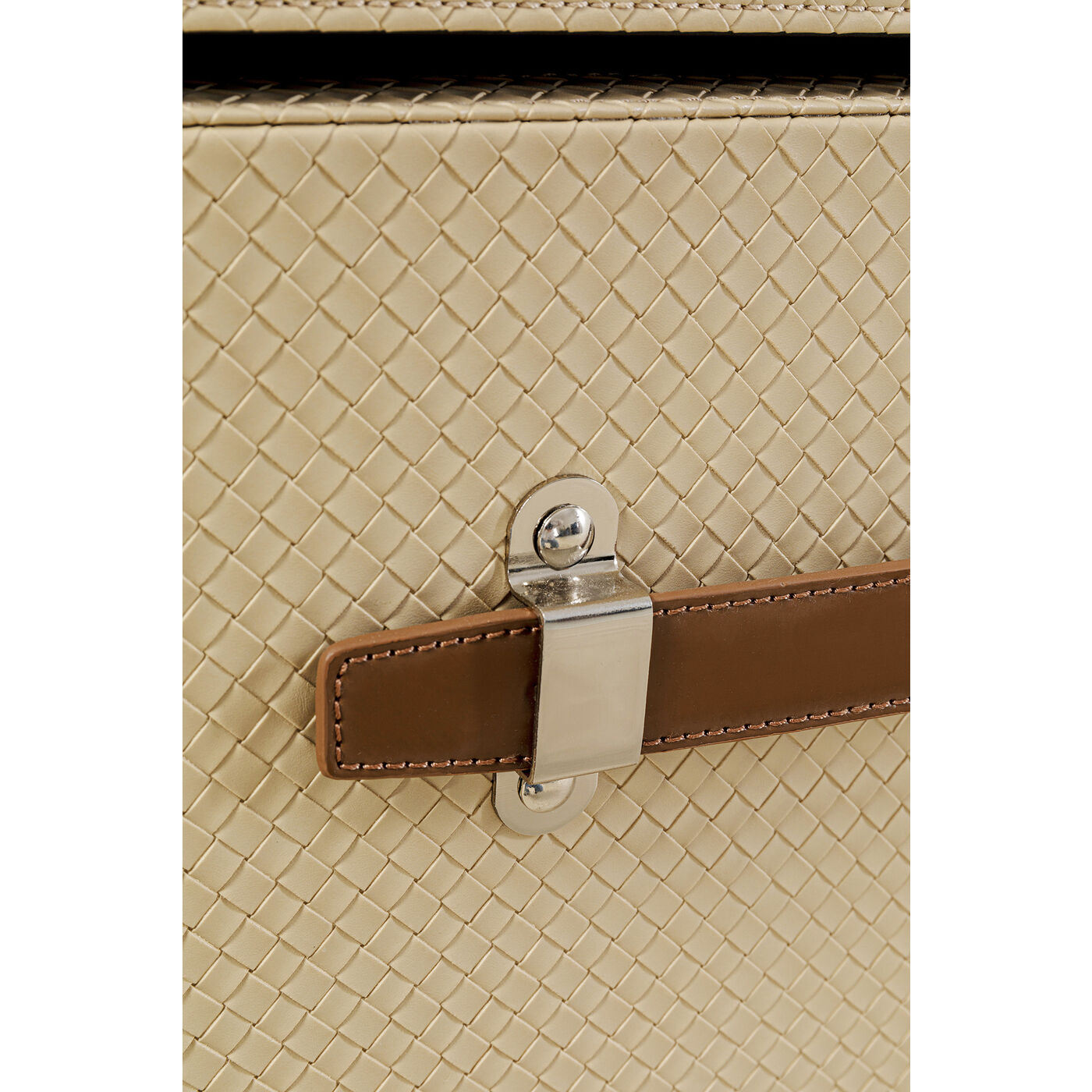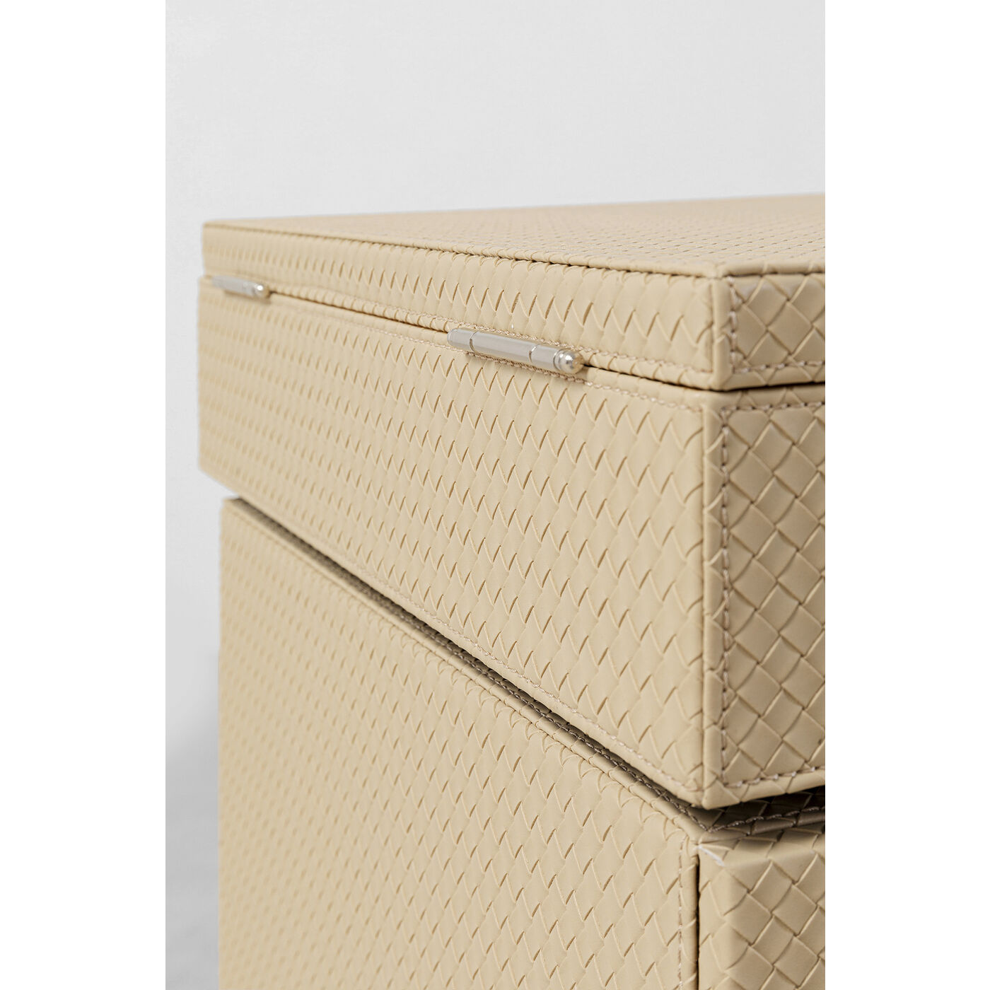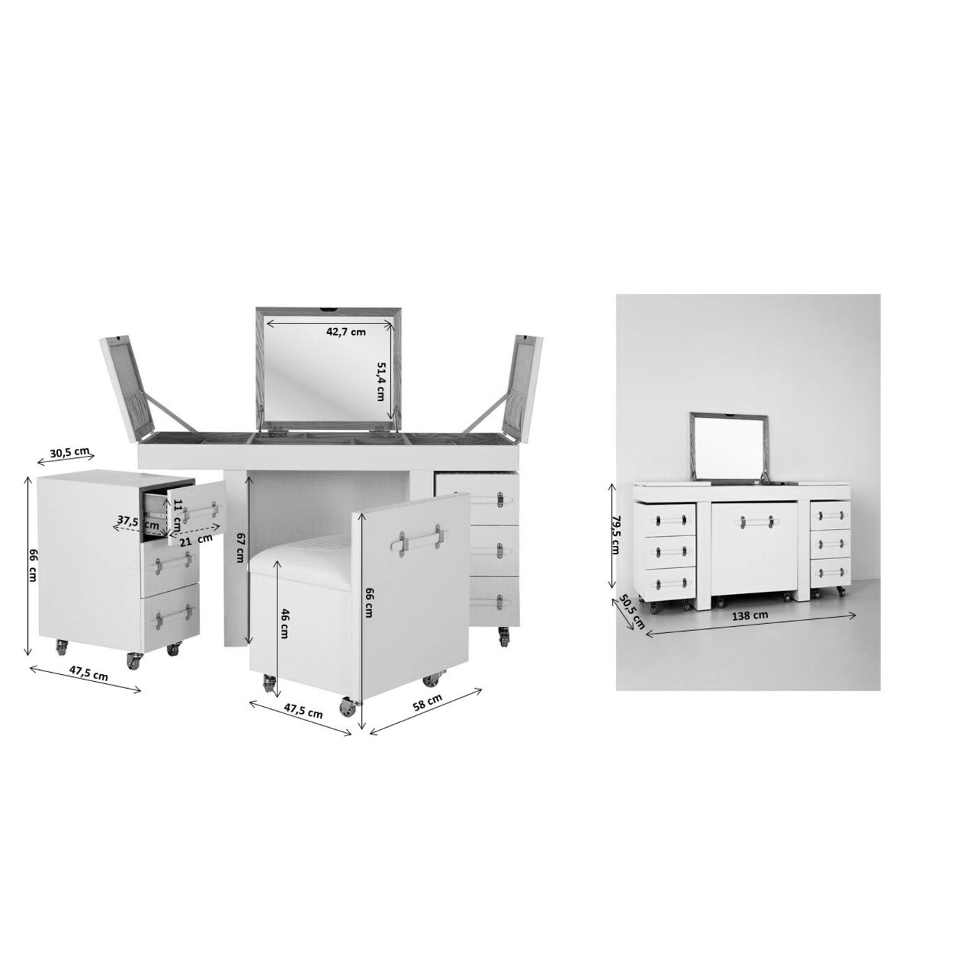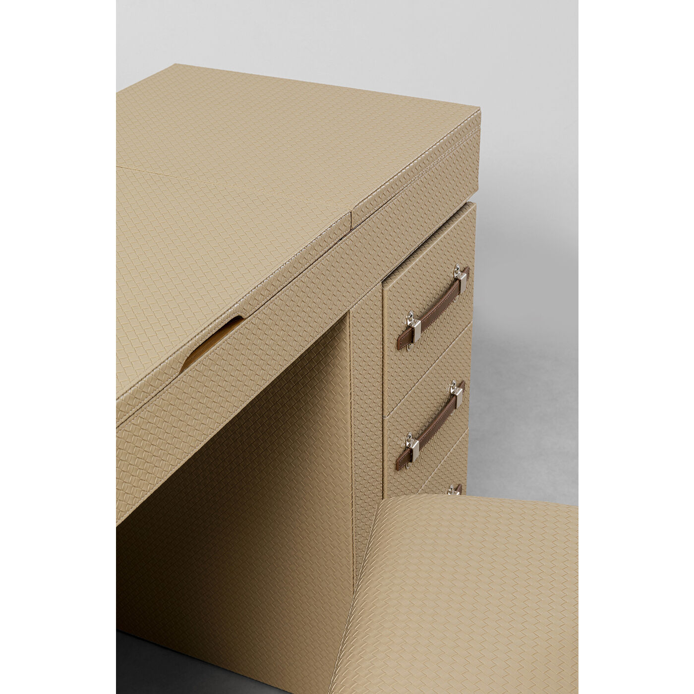 Give your make-up area a new dimension with this mobile dressing table in the warm colour of beige. The elegant dressing table features numerous, functional details. It is sturdily made of medium-density fibreboard covered with a chic wicker-look cover. Other details are created with ash veneer. The dressing table combination is mounted on steel casters so you can move it around easily. This dressing table has its own stool (56x5x46x57cm) which fits completely under the table. There are also two mobile containers with drawers, as well as numerous compartments in the table top to store your makeup and beauty products and other cosmetic utensils in a functional and well-protected way. The surface of the dressing table makes an impact with a classy wicker look, while the easy-care cover made of coated fabric ensures that your will always look as good as new. Be inspired by this dressing table and put on your make-up like a star!