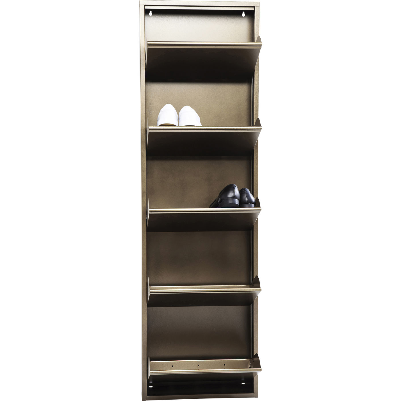 An elegant shoe cupboard with a modern look - This stylish tilting shoe cupboard is made of powder-coated sheet steel. The cupboard features three spacious tilting compartments which provide room for lots of shoes, protecting them against dust and other hazards, and creating order among your shoe collection! In an exclusive silver look with a striking pattern on the front, this shoe cupboard will be a match for many furnishing styles. Design: Giorgio Cavallo. Available in various versions.