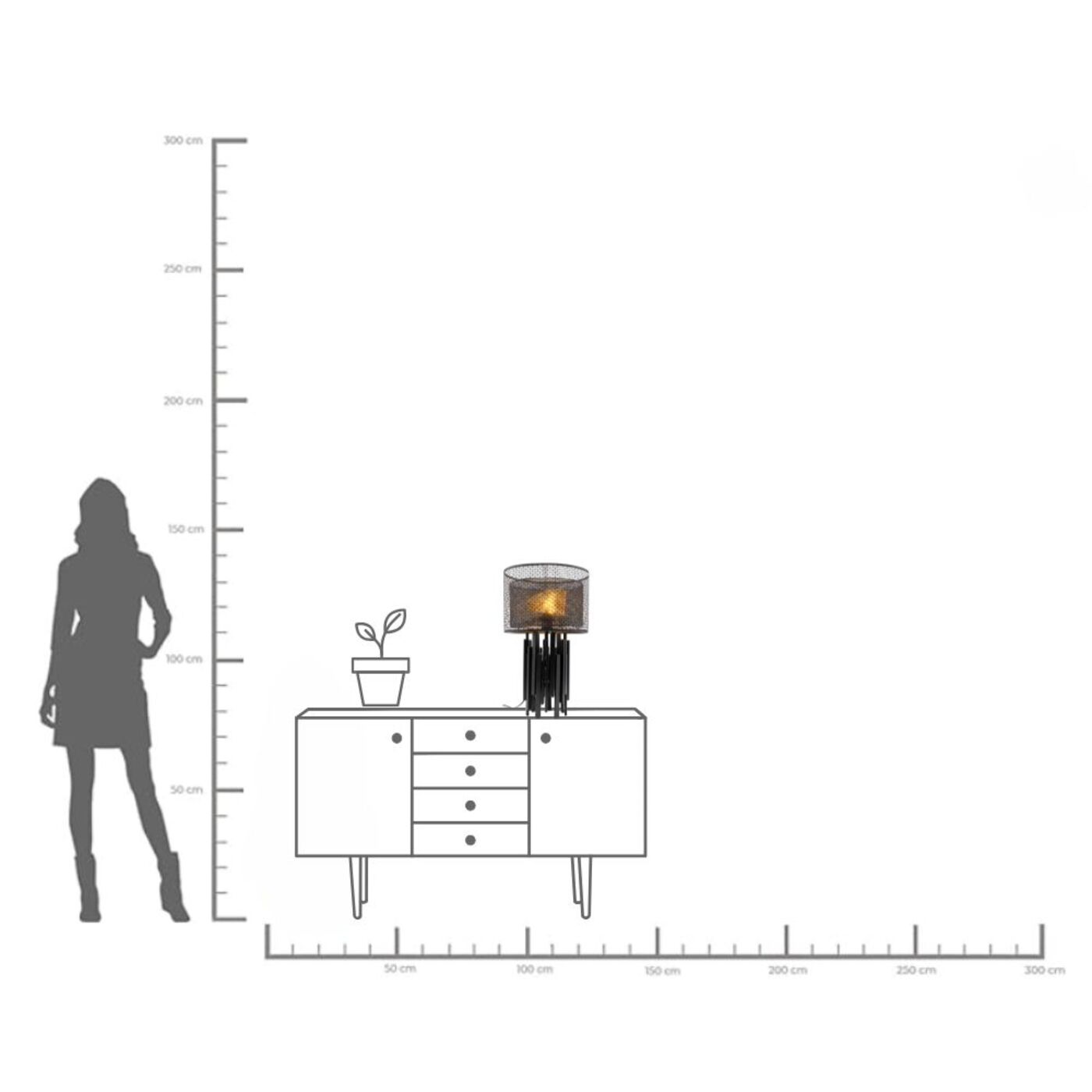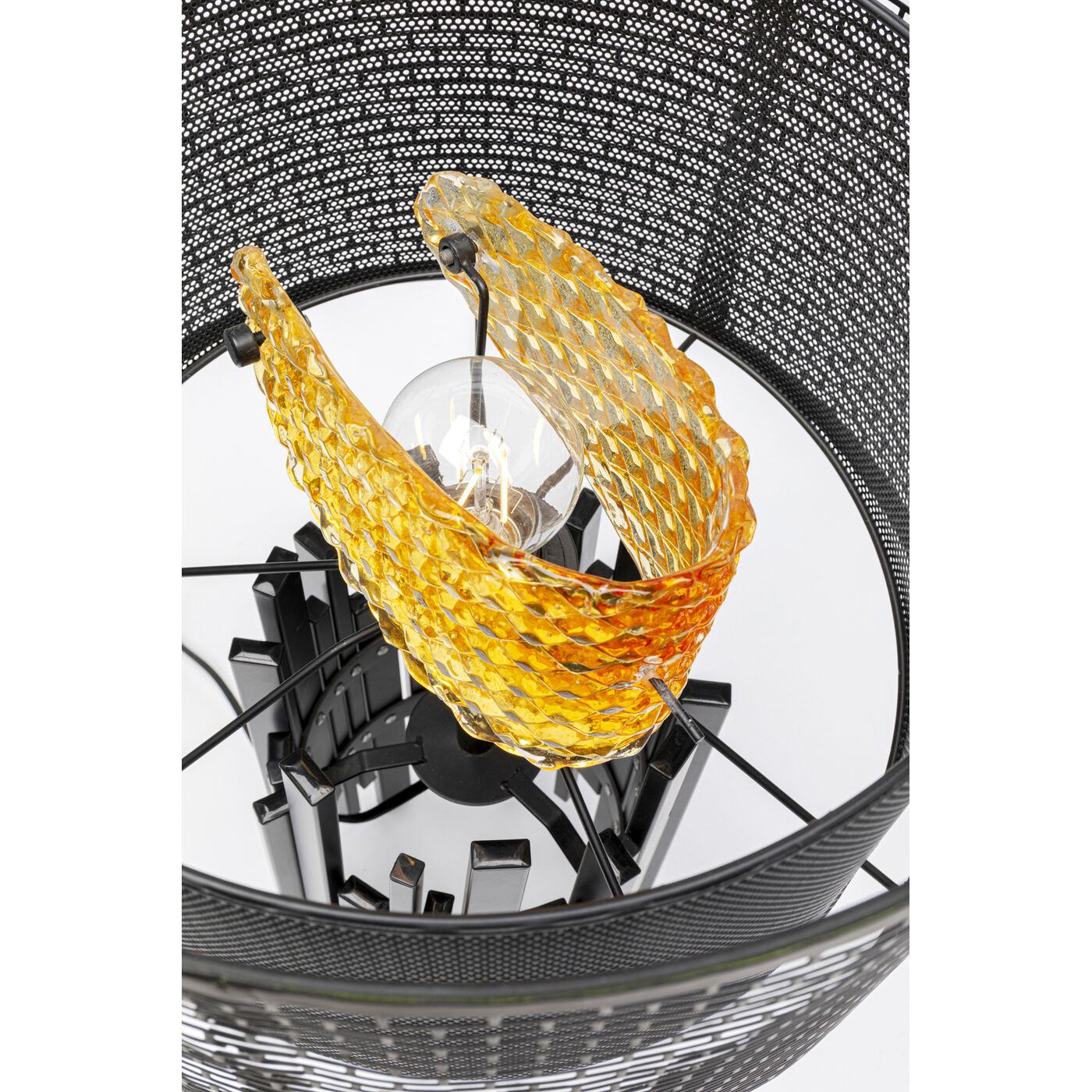 A luminous work of art with character: this table lamp impresses with its sculptural design and exciting contrasts. Two black metal shades with a grid structure meet a shiny glass element in a warm gold tone - a fascinating interplay of light, shadow and form. The solid base with a matt surface adds stability and a touch of modern industrial flair to the ambience. It is particularly effective on sideboards, consoles or bedside tables, where it also provides atmospheric accents as a stylish light source. Table lamps like these combine function with expressiveness and effectively set the scene in any interior - for rooms with style and substance. 230 V, 50/60 Hz, bulb fitting E27, number of illuminant 1, max. 40 watt, without illuminant, replacable illuminant