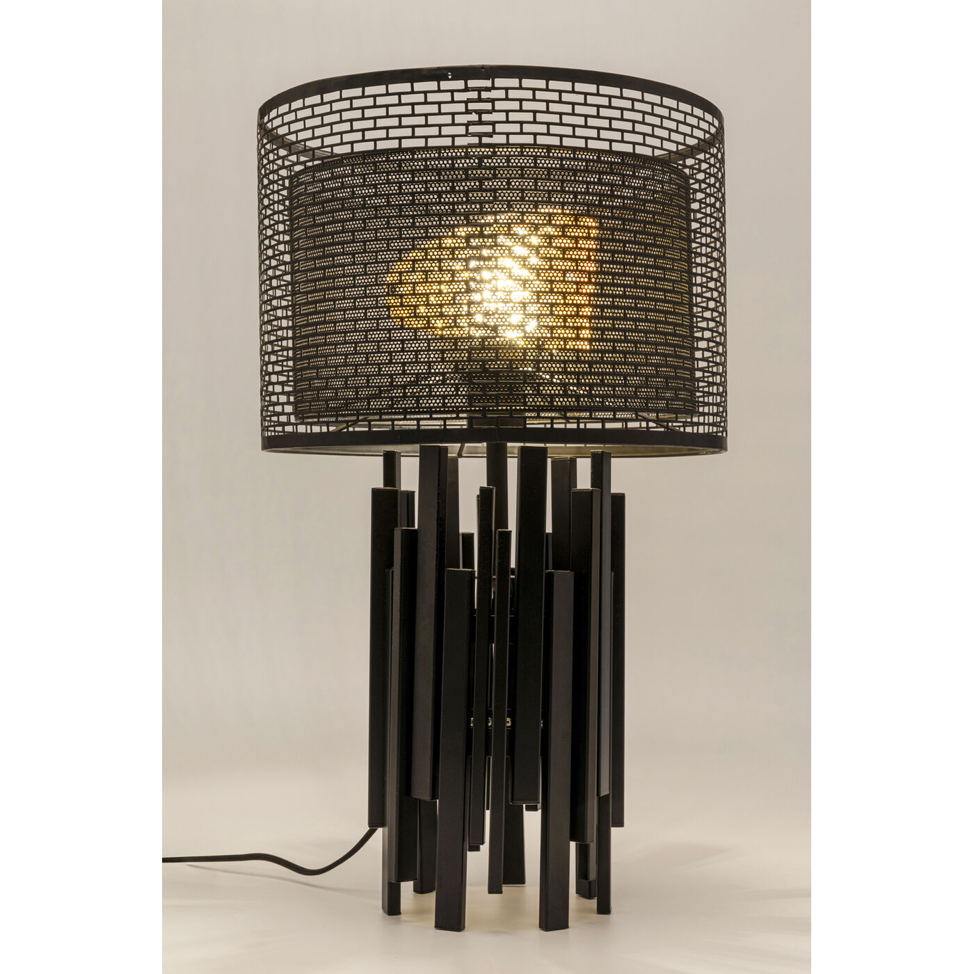 - Two black steel shades with a lattice-like appearance make this lamp a geometric design highlight
