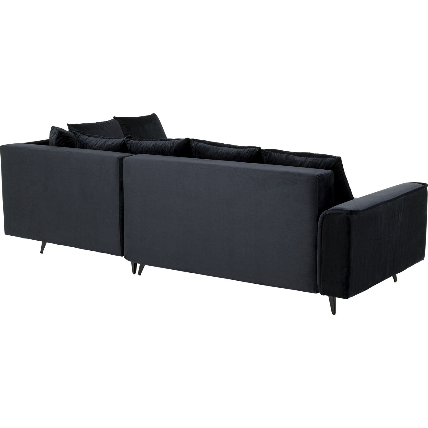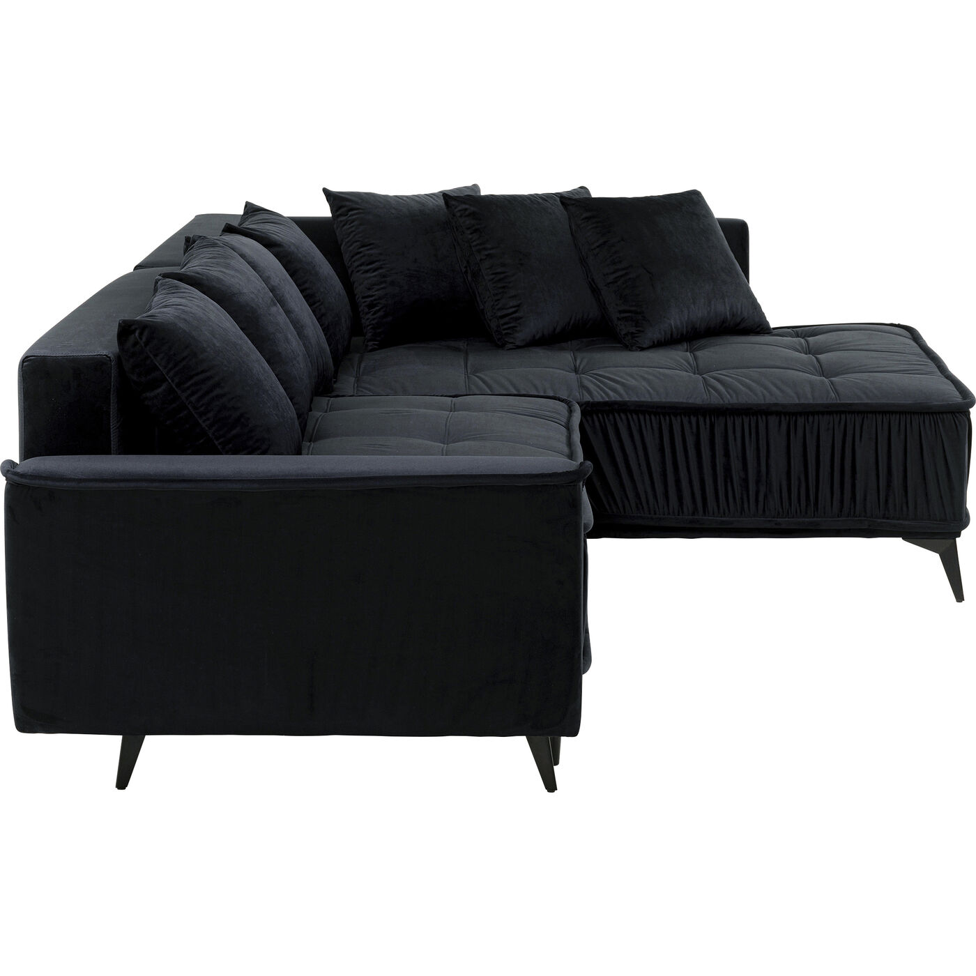 Ein Sofa wie gemacht für stilvolle Abende und gemütliche Stunden: Das Ecksofa Moon kombiniert klassisches Chesterfield-Flair mit modernem Komfort. Der tiefschwarze Samtbezug schimmert edel im Licht und verleiht dem Raum eine luxuriöse, fast dramatische Ausstrahlung. Raffinierte Faltenakzente an den Fronten und filigrane Metallfüße unterstreichen das elegante Design. Dank großzügiger Polsterung, Nosagunterfederung und elastischer Gurtaufhängung bietet das Sofa höchsten Sitz- und Liegekomfort – perfekt, um einfach einzutauchen und zu entspannen. Mit wenigen Handgriffen verwandelt es sich in eine komfortable Schlafgelegenheit für Gäste. In Kombination mit goldenen Akzenten, Glas- oder Marmortischen entsteht ein harmonischer Look zwischen klassischer Eleganz und modernem Lounge-Feeling.