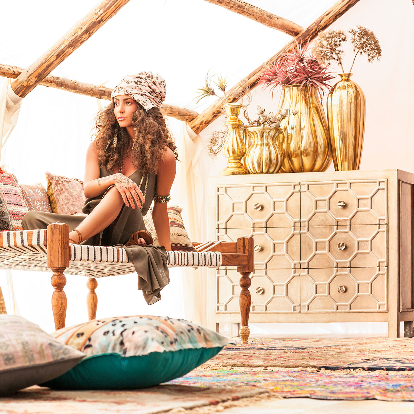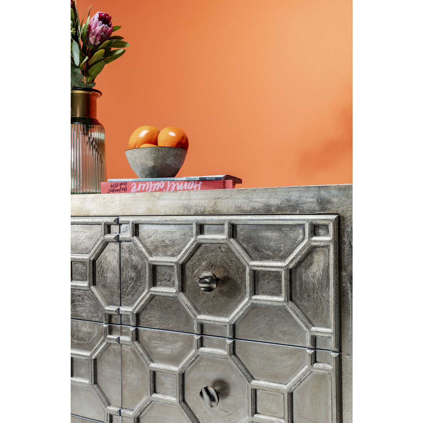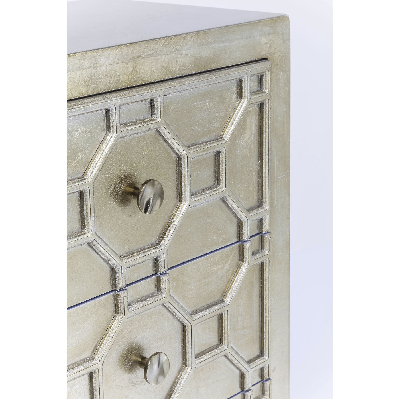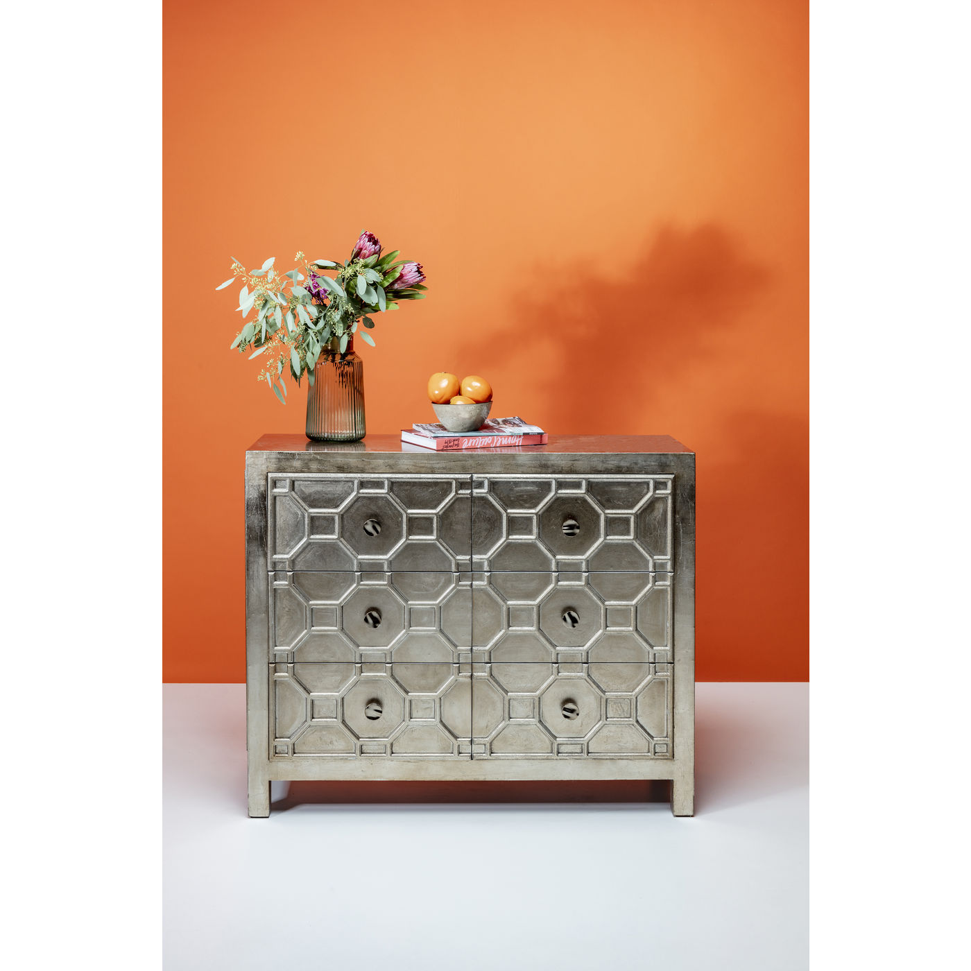 Ambiance ethnique, shabby chic ou simplement désir d’une commode sensuelle et décorative - ces rêves vivants deviennent réalité avec les meubles de rangement de la série Alhambra. Les façades profilées rappellent les ornements orientaux, le design est moderne et simple. Avec la finition de la peinture dans un ton métallique chaud et discret, qui scintille autour de la couleur or, Alhambra apporte une ambiance mystérieuse dans la pièce. Pratiques sont les grands tiroirs pour le stockage. En raison de la production manuelle, de légers écarts de couleur peuvent se produire dans la peinture et sont intentionnels.