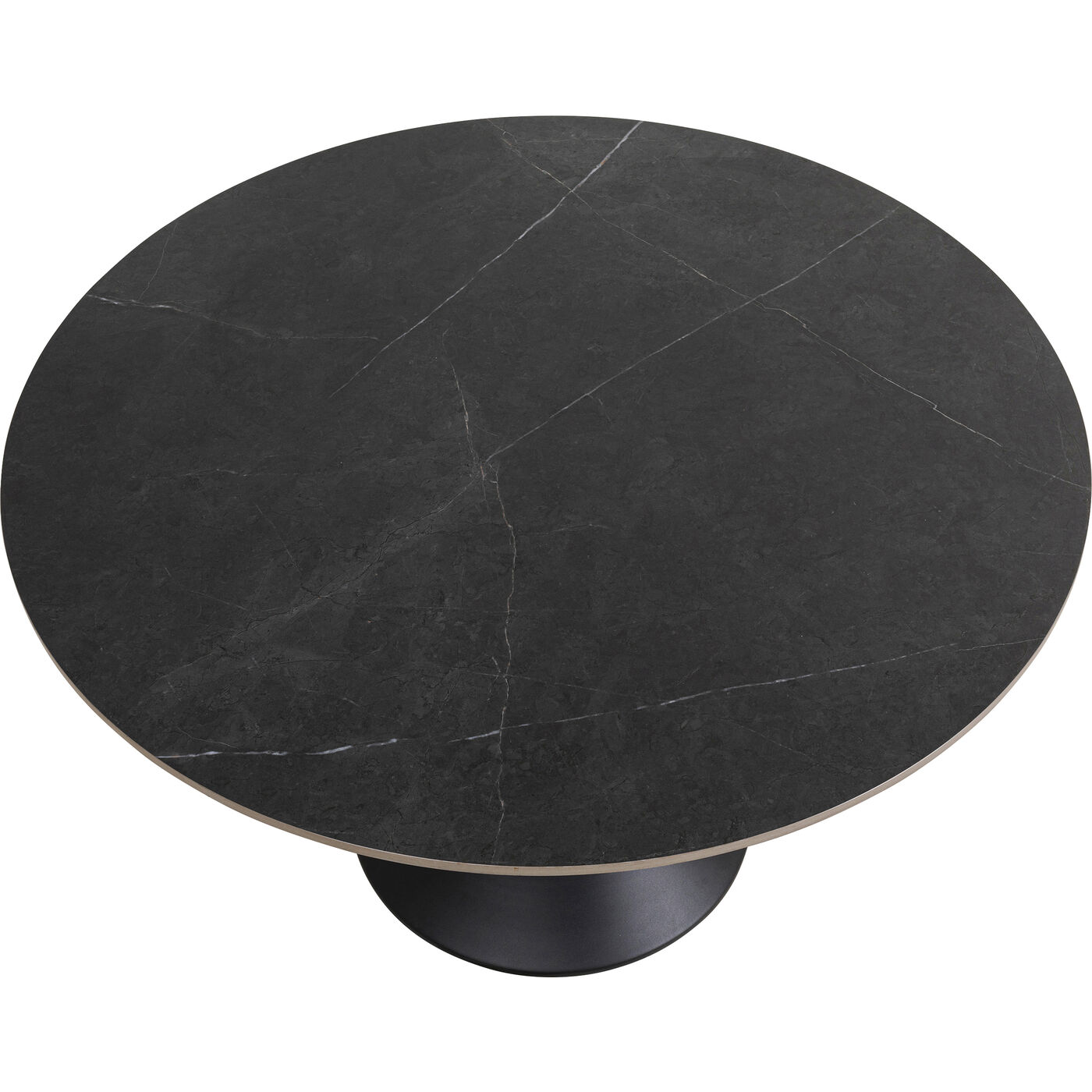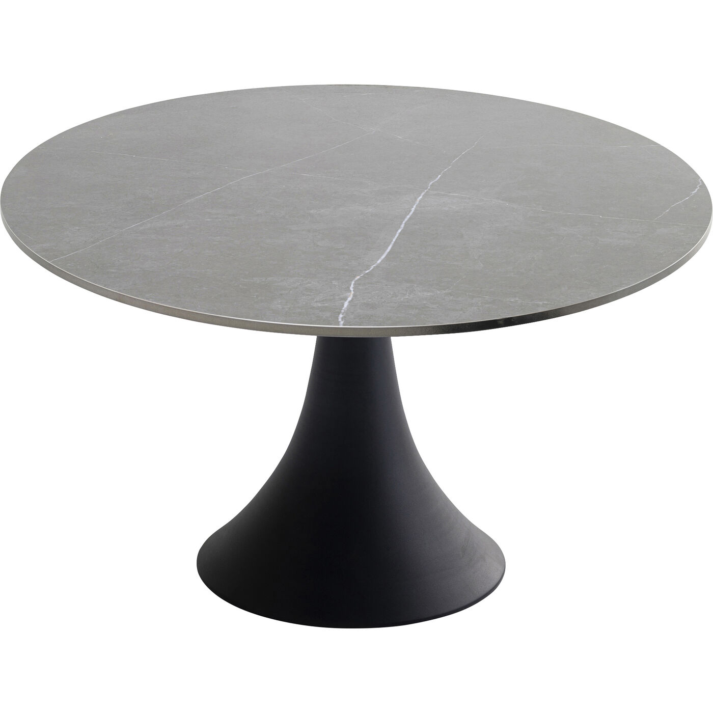 Une table de salle à manger ronde avec des vibrations futuristes : avec cette table sculpturale tout en noir, vous obtenez définitivement un meuble moderne dans votre maison ! Le grand avantage de cette table est qu elle peut être utilisée aussi bien comme table de jardin sur la terrasse ou le balcon que comme table dans la salle à manger. Le plateau de table de haute qualité en céramique foncée rappelle la pierre naturelle par ses veinures et son aspect. Le pied extravagant en métal revêtu par poudre en forme de tulipe complète le look. Avec la couleur noire, vous ajoutez en outre un contraste captivant à votre style de vie, que ce soit à l intérieur ou à l extérieur. Nous recommandons de stocker la table à l abri des projections d eau. Offre de la place pour environ 4 à 5 personnes.