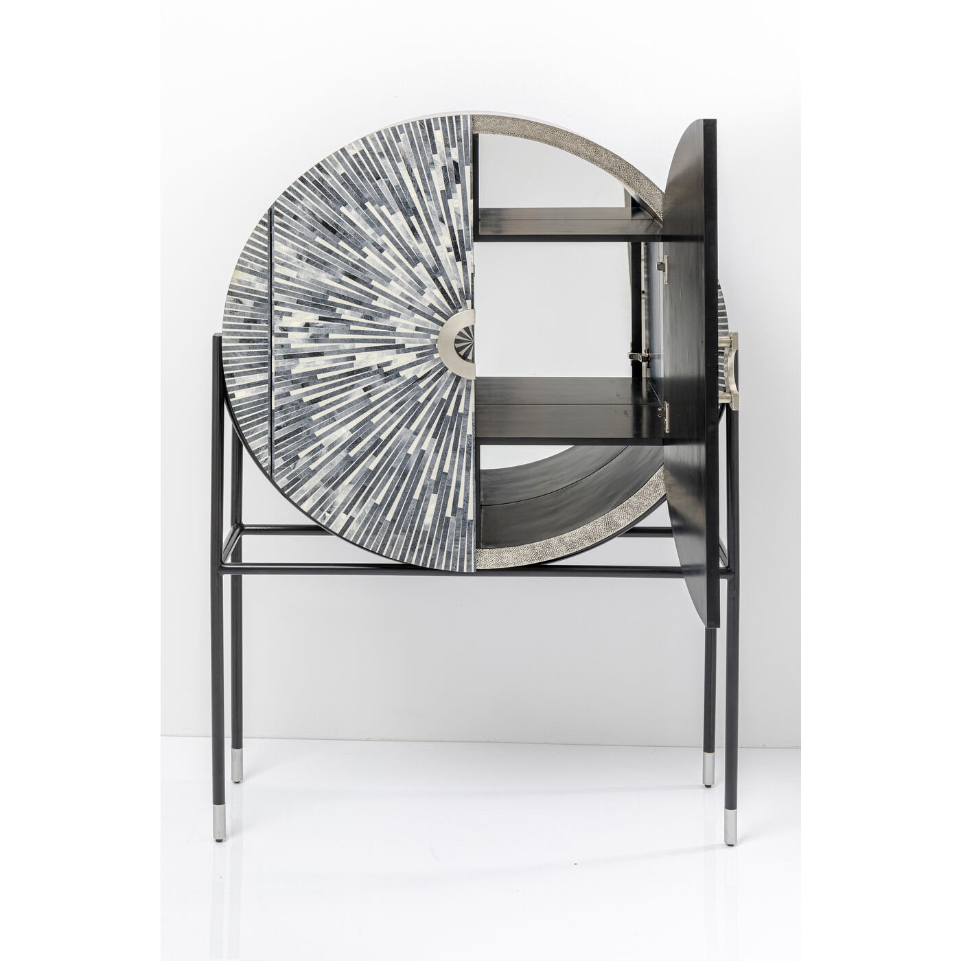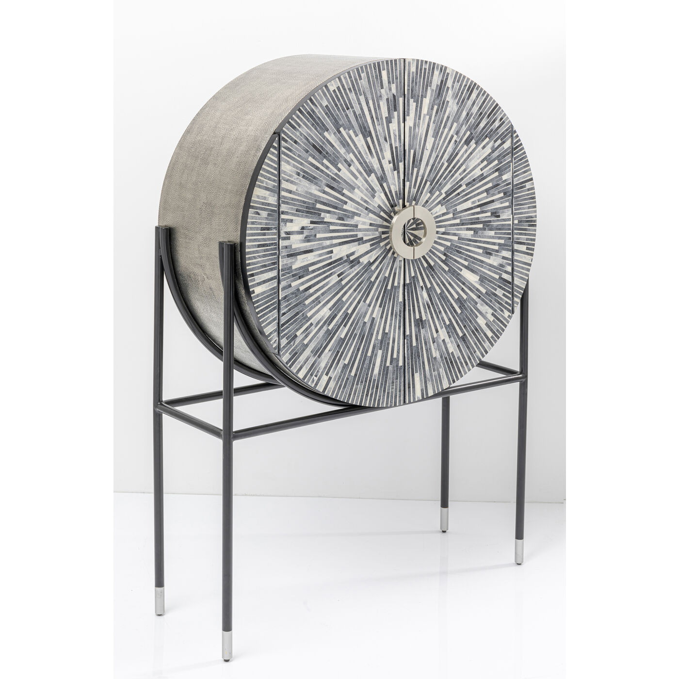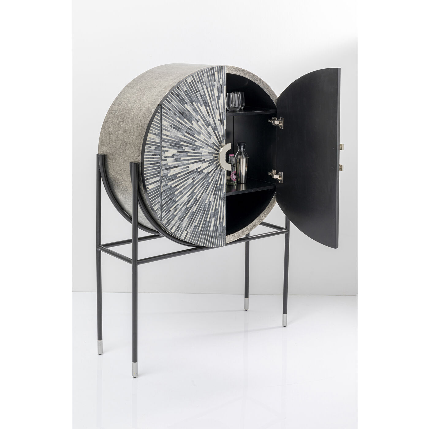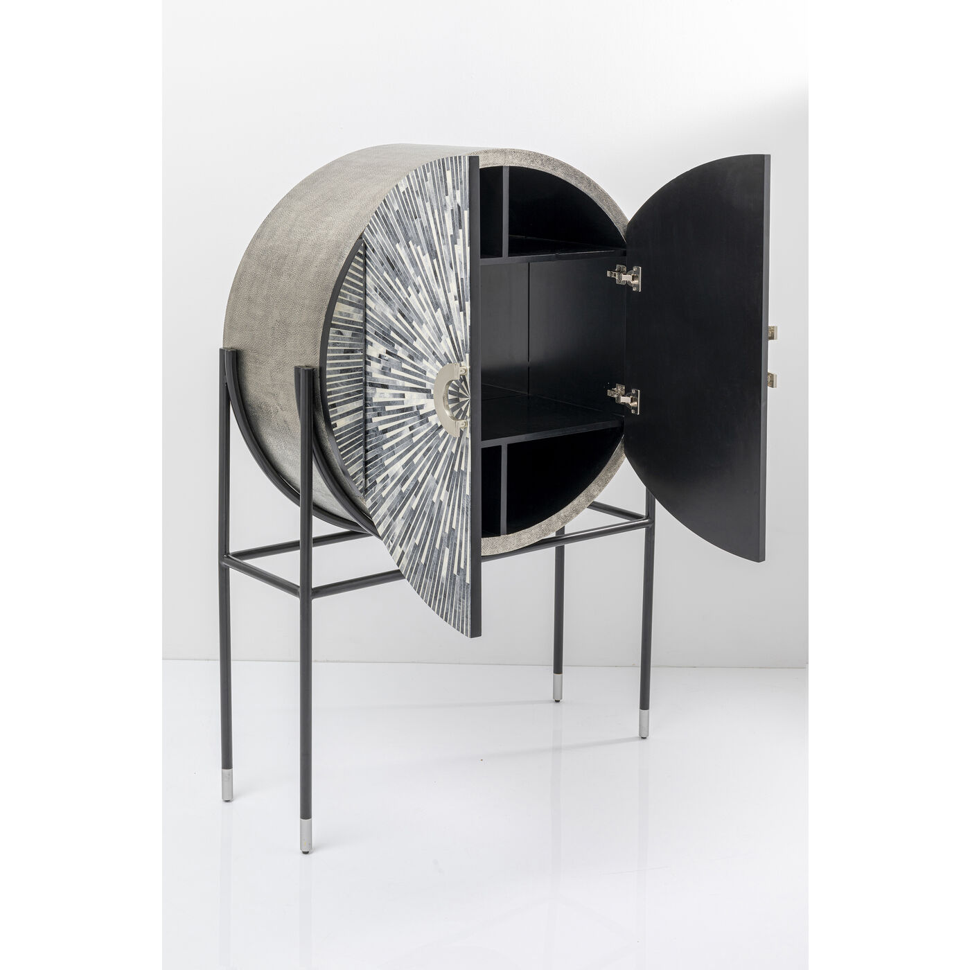 Se lasci scivolare le dita sul fronte liscio con le opere a intarsio e scopri le superfici martellate del corpo rotondo, allora puoi indovinare quanto tempo e dettagli sono stati dedicati a questi mobili fatti a mano. Poiché ogni pezzo di questi armadi da soggiorno è unico, non ci sono due copie uguali. Ma il motivo radiale in diverse tonalità di grigio è sempre affascinante. Il telaio dell'armadio in acciaio verniciato a polvere è visivamente trattenuto per lasciare il ruolo principale alla forma rotonda dell'armadio. Progettato come un bar della casa, dove è anche possibile riporre alcune bottiglie che giacciono al piano di sotto, Zoom può brillare anche come oggetto di design in altre parti della casa. Come farebbe questo mobile in camera da letto, ad esempio, per la lingerie raffinata o la collezione di profumi? Cosa penserebbero i tuoi ospiti se presentassi e utilizzassi Zoom come mobile decorativo per corridoi? Un mobile di design fatto a mano realizzato con materiali di alta qualità come questo è sicuro di trovare un posto ancora e ancora, un pezzo con carattere che non perde il suo valore.