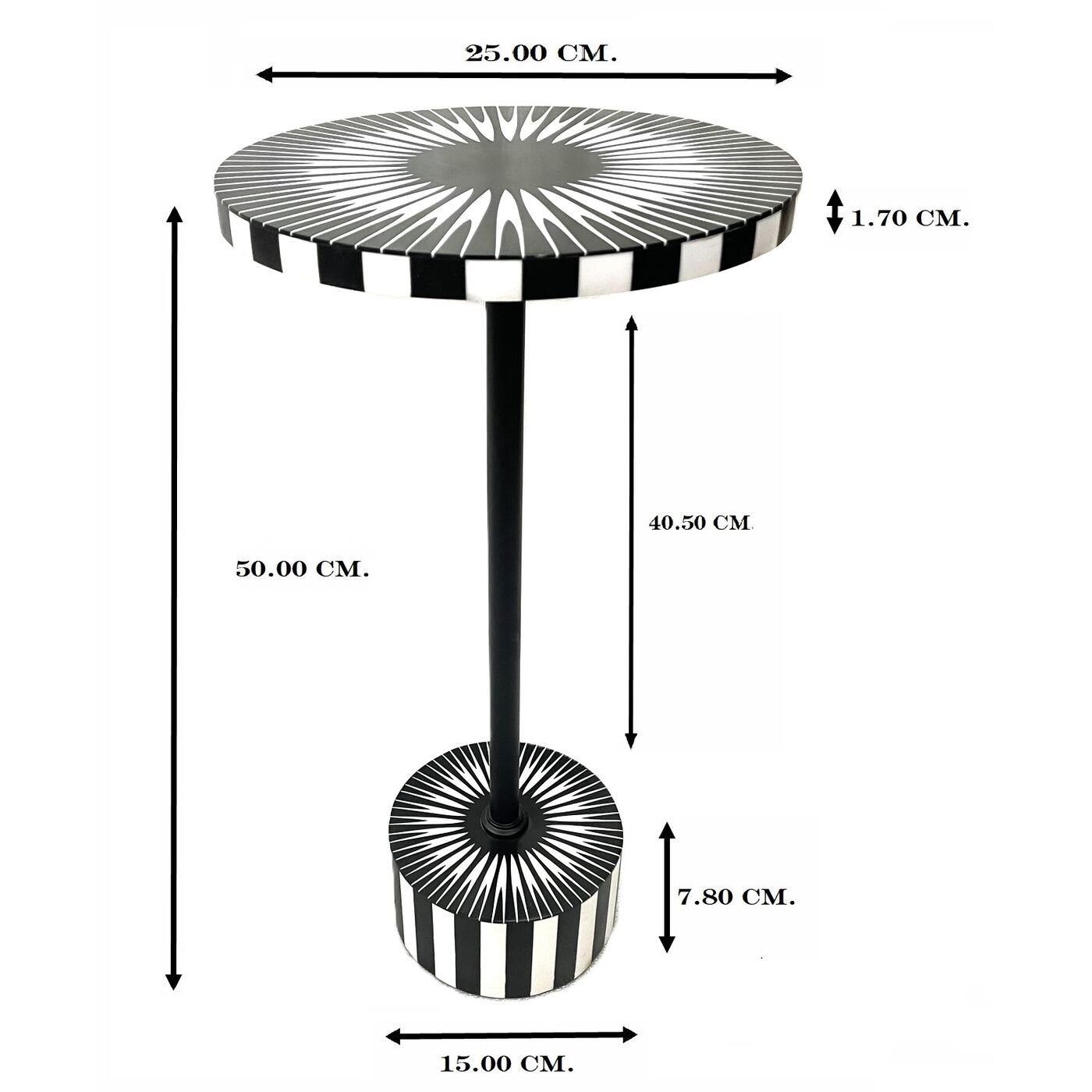 Dieser runde Beistelltisch setzt mit seinem dynamischen, irisartigen Muster in Schwarz und Weiß einen stilvollen Kontrast im Raum. Das schlanke Metallgestell sorgt für Stabilität, während die Polyresin-Oberfläche die Platte pflegeleicht und langlebig macht. Handgearbeitet und mit individuellem Charakter versehen, wird er schnell zum Hingucker neben Sofa oder Lieblingssessel. Ob als Ablage für Accessoires, kleine Drinks oder dekorative Highlights – der Tisch verbindet praktische Funktion mit charmantem Design und peppt jedes Wohnzimmer mit einer Portion Eleganz und modernen Akzenten auf. Ein echtes Statement-Piece, das Atmosphäre, Stil und Form auf harmonische Weise miteinander vereint.