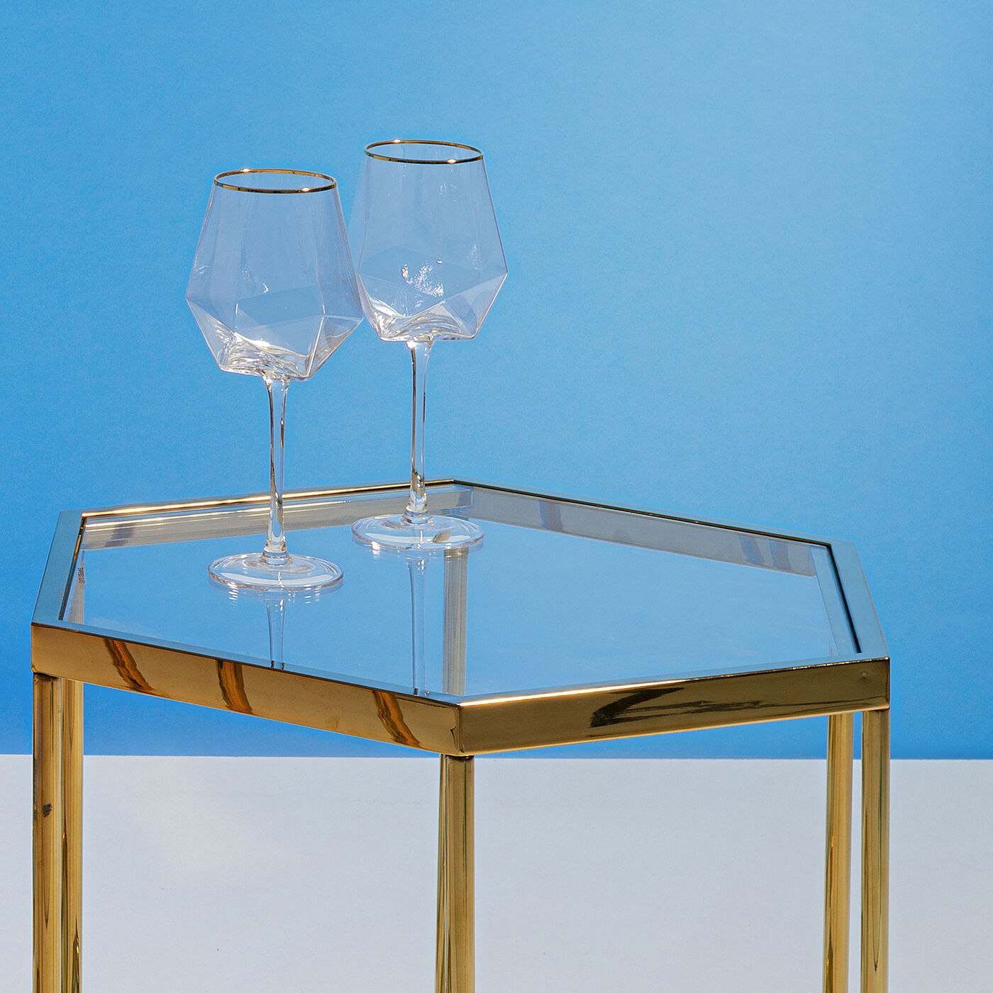 Sono i punti salienti su un tavolo ben apparecchiato e di importanza centrale per l'immagine decorativa generale - occhiali. Questo bicchiere da vino Diamond si distingue due volte, per il bordo dorato del vetro e la sua forma geometrica.