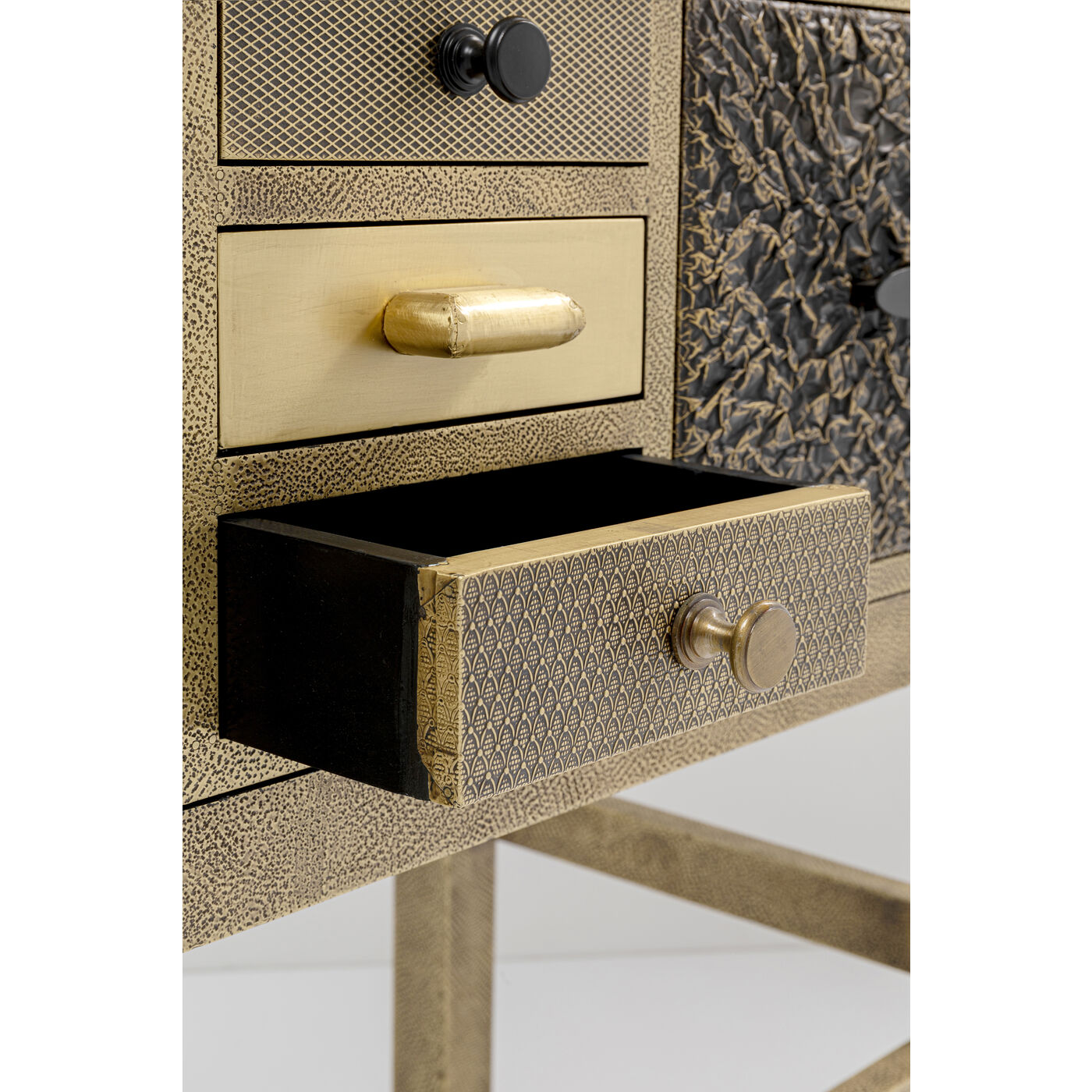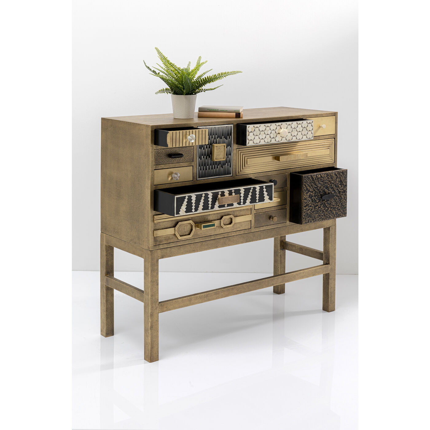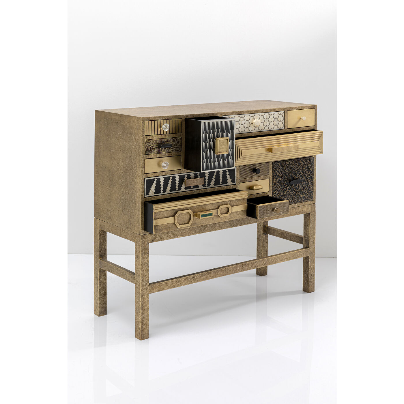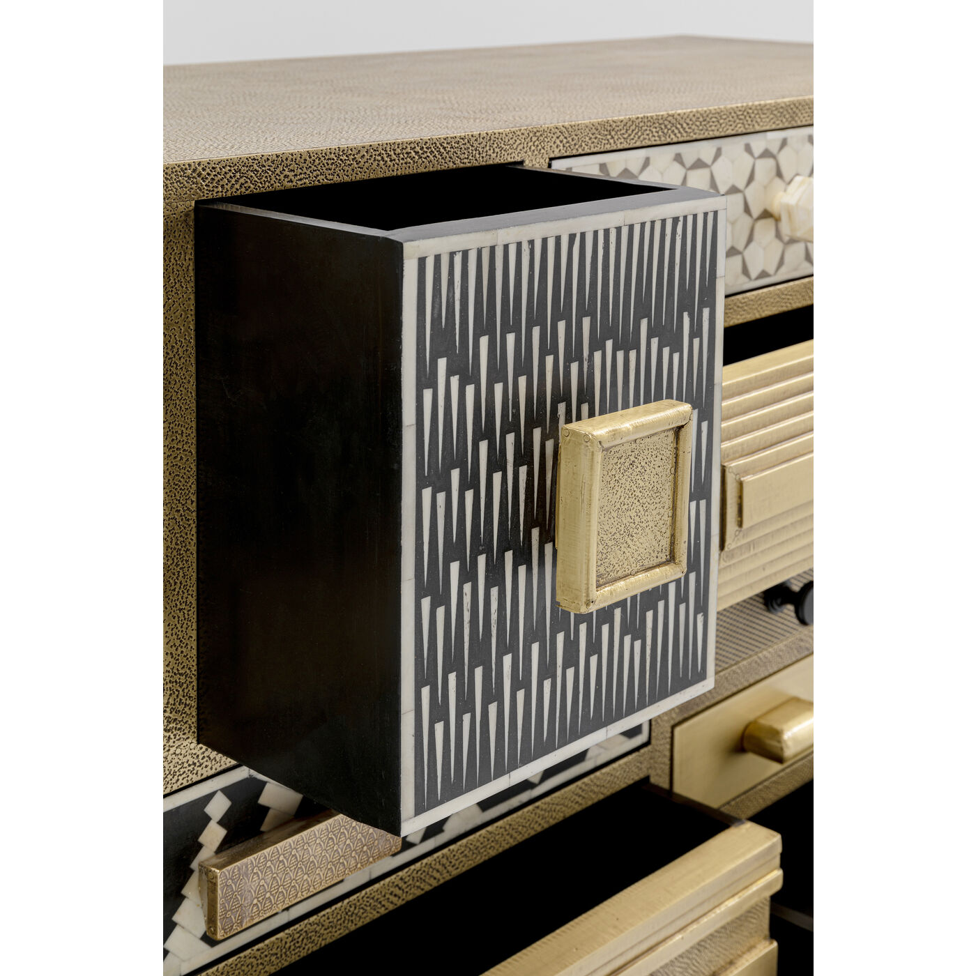 Questa credenza realizza i sogni di interior design delle Mille e una notte. Realizzato nell'artigianato dell'India settentrionale, l'oggetto di arredamento di alta qualità è unico e un arricchimento stravagante per la tua casa. Per l'elaborato lavoro di intarsio, vengono utilizzati anche materiali naturali come le conchiglie, le maniglie sono in vetro e il corpo in legno è avvolto ad arte con lamine di metallo martellate. La variegata parte anteriore dell'alta cassettiera non lascia sorgere un tocco di noia.