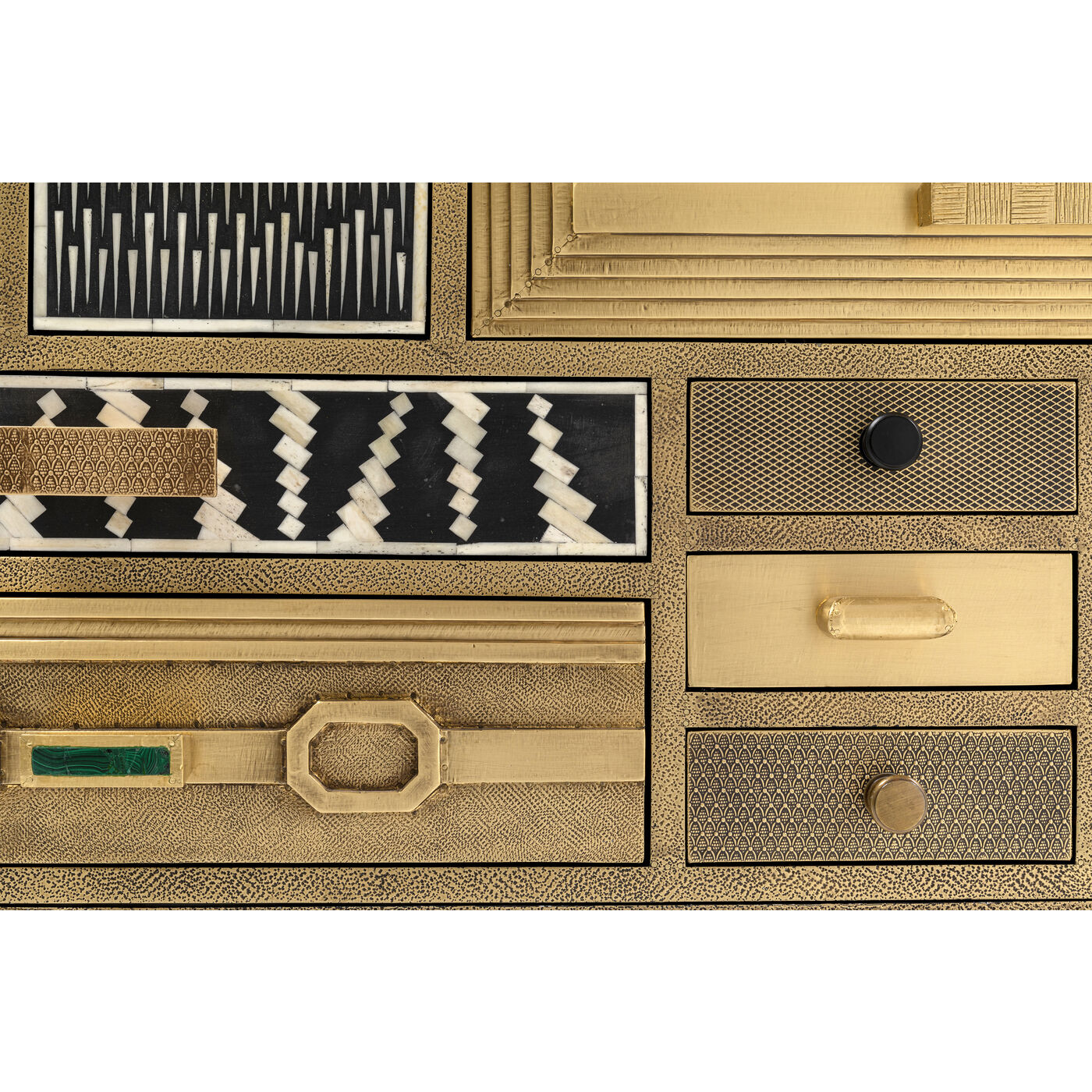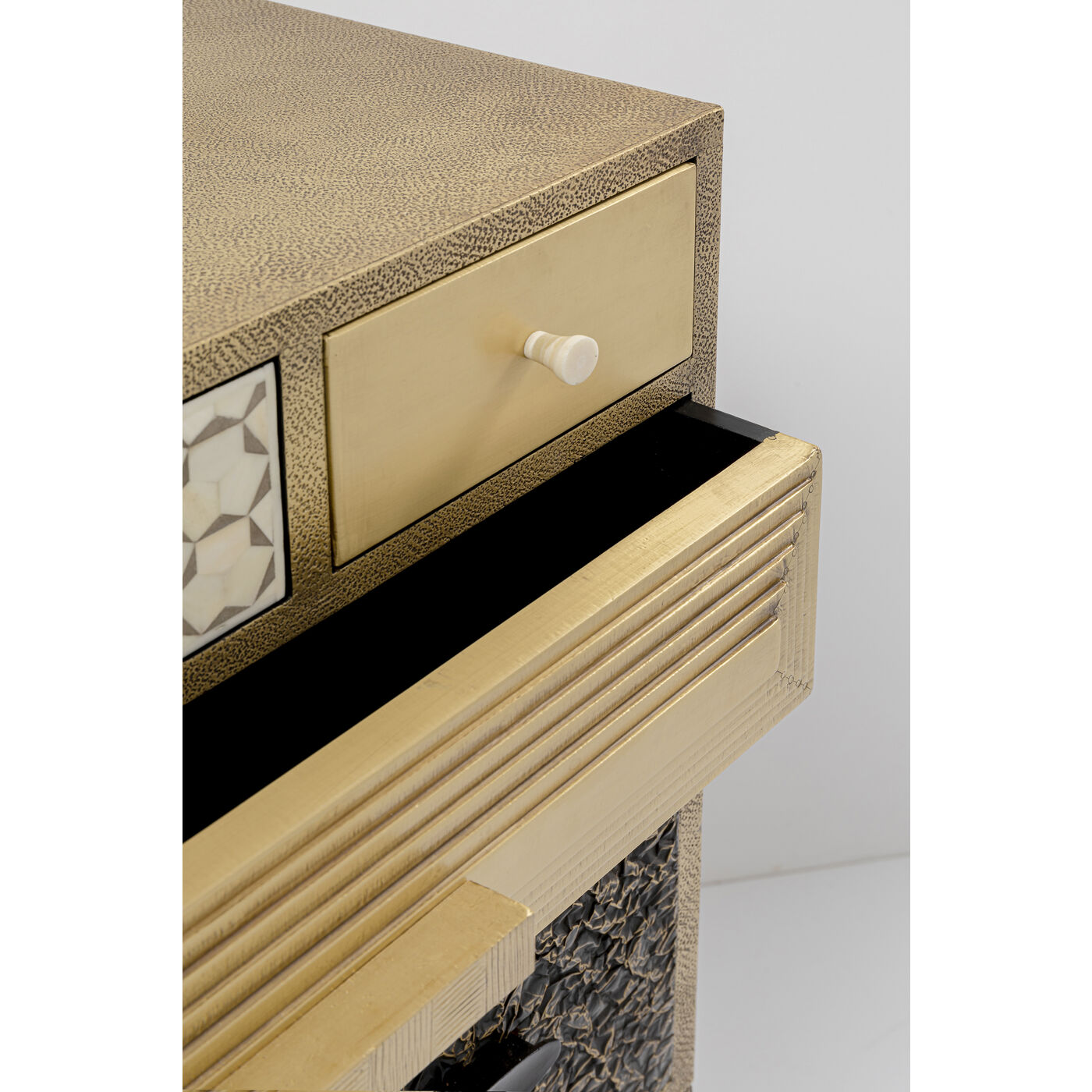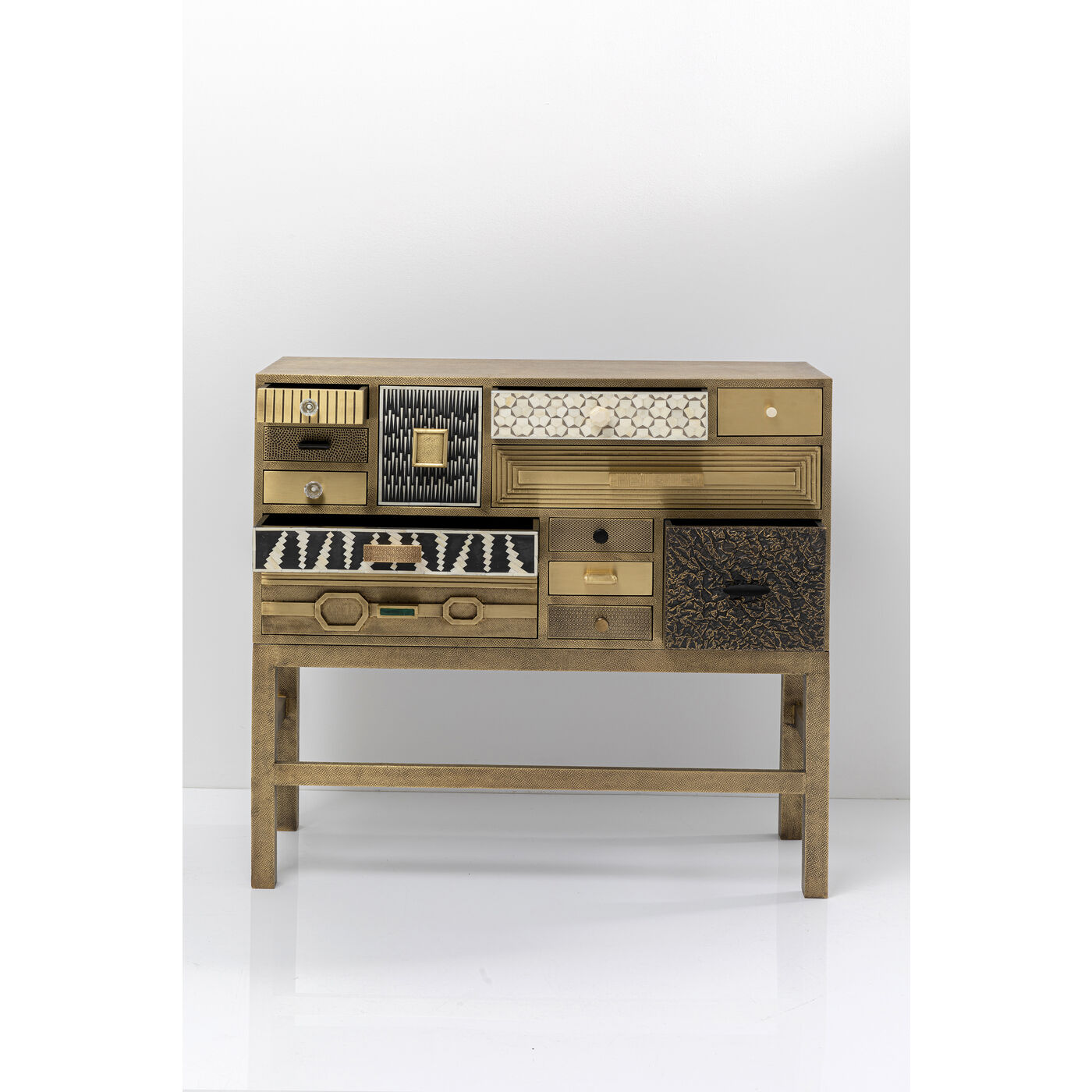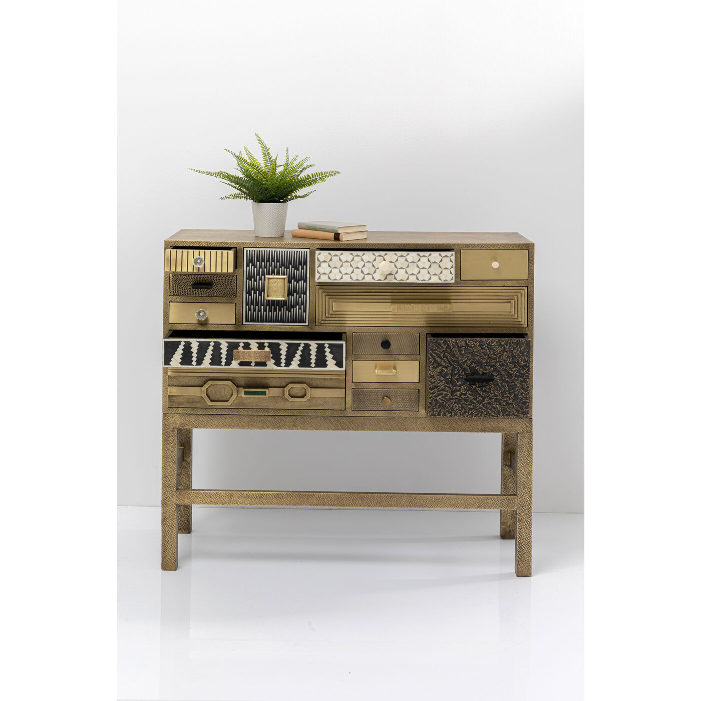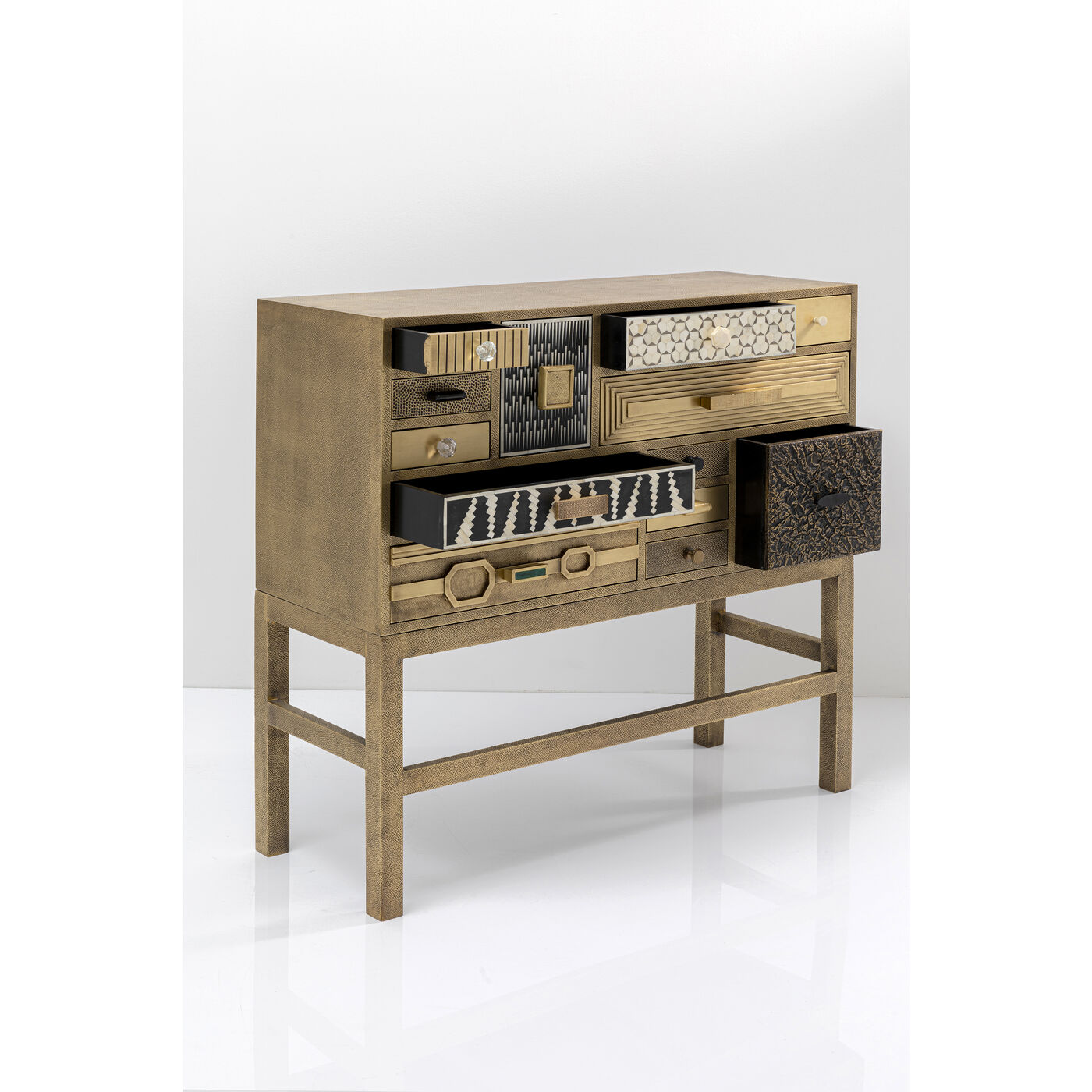 Questa credenza realizza i sogni di interior design delle Mille e una notte. Realizzato nell'artigianato dell'India settentrionale, l'oggetto di arredamento di alta qualità è unico e un arricchimento stravagante per la tua casa. Per l'elaborato lavoro di intarsio, vengono utilizzati anche materiali naturali come le conchiglie, le maniglie sono in vetro e il corpo in legno è avvolto ad arte con lamine di metallo martellate. La variegata parte anteriore dell'alta cassettiera non lascia sorgere un tocco di noia.