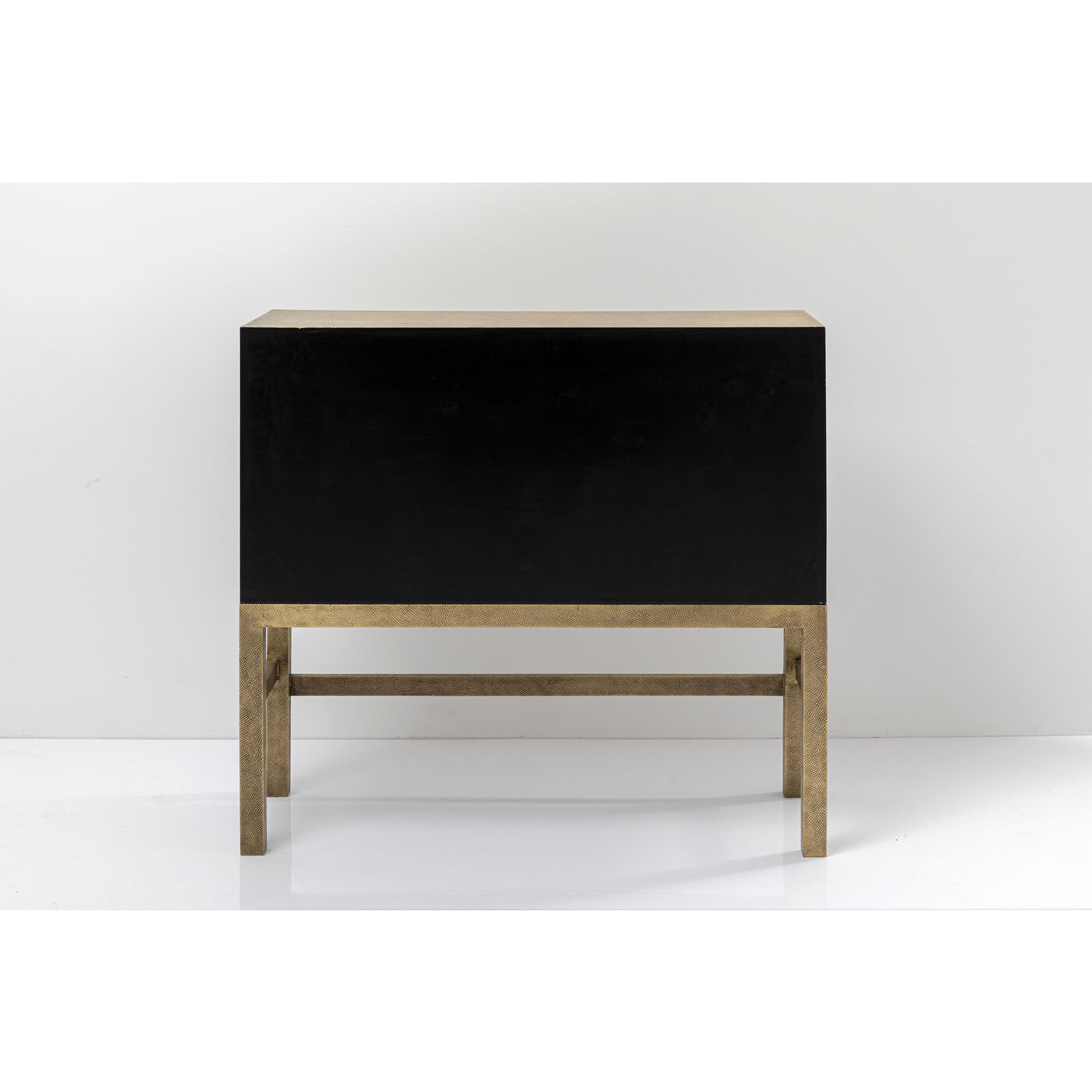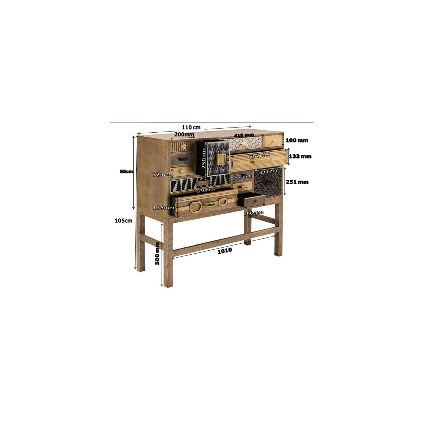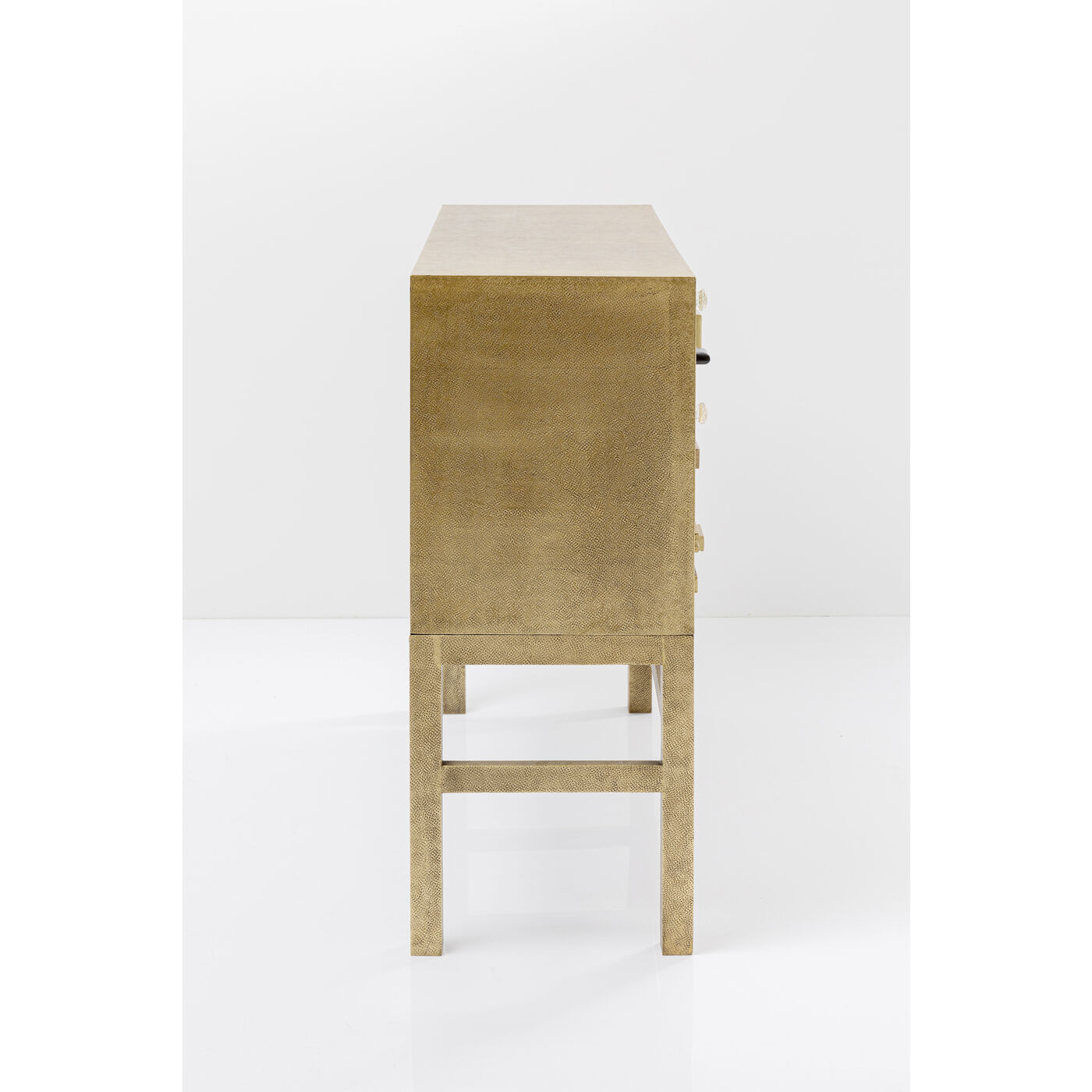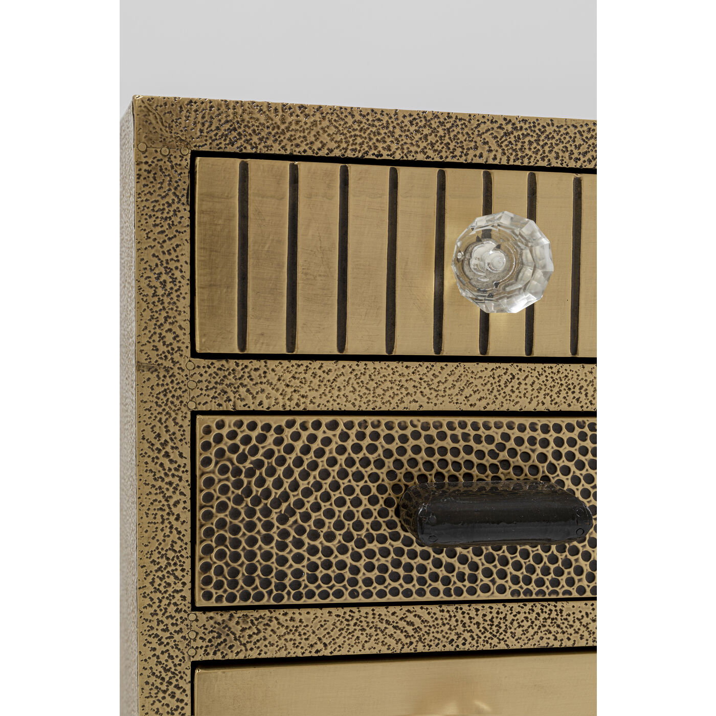 Questa credenza realizza i sogni di interior design delle Mille e una notte. Realizzato nell'artigianato dell'India settentrionale, l'oggetto di arredamento di alta qualità è unico e un arricchimento stravagante per la tua casa. Per l'elaborato lavoro di intarsio, vengono utilizzati anche materiali naturali come le conchiglie, le maniglie sono in vetro e il corpo in legno è avvolto ad arte con lamine di metallo martellate. La variegata parte anteriore dell'alta cassettiera non lascia sorgere un tocco di noia.