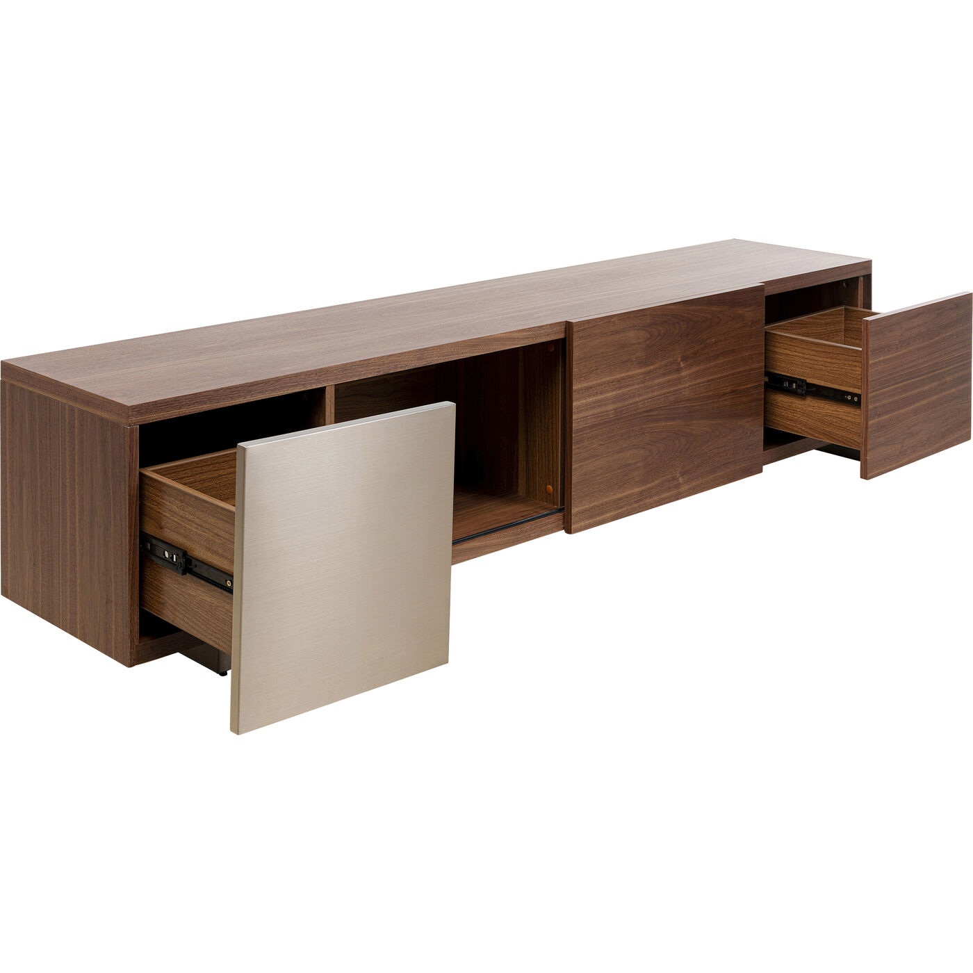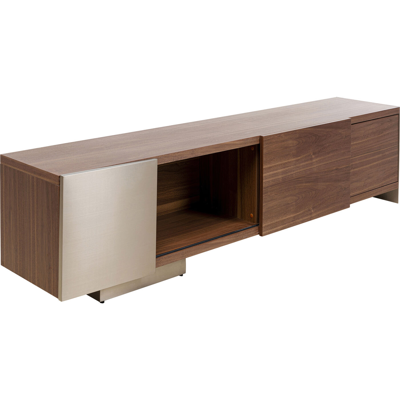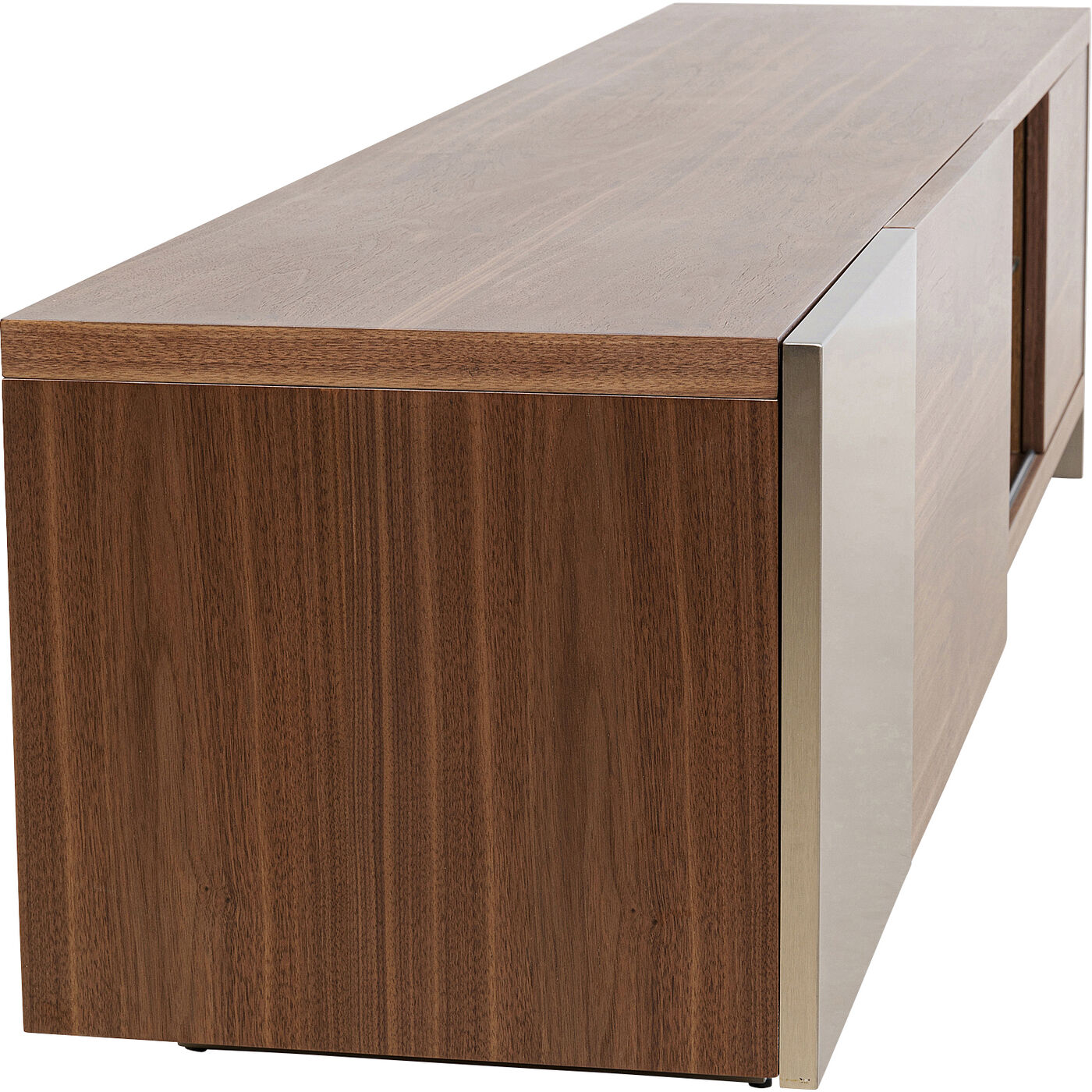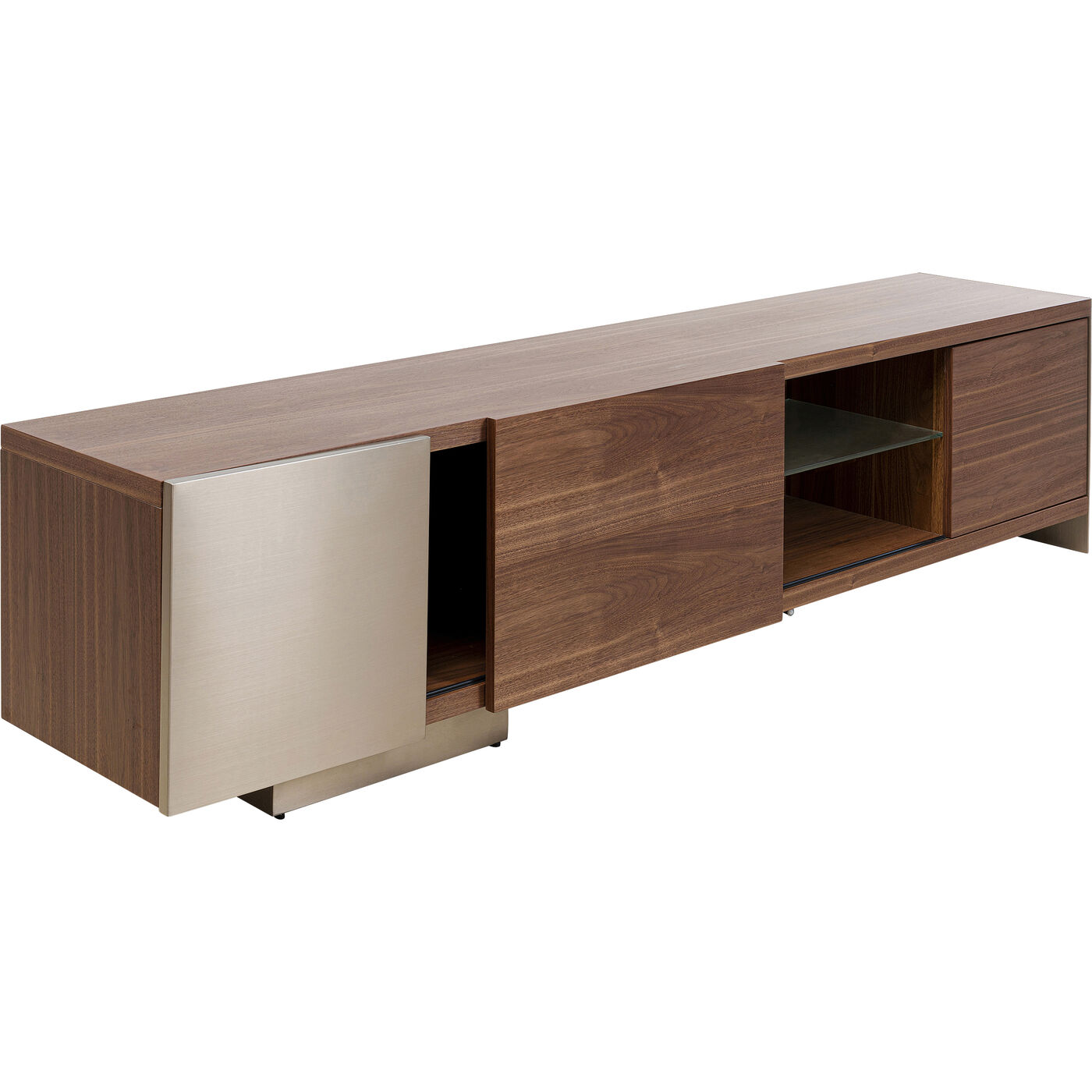 - Das TV-Board ist hochwertig mit vernickeltem Edelstahl, satiniertem Glas und Walnuss-Furnierholz gearbeitet