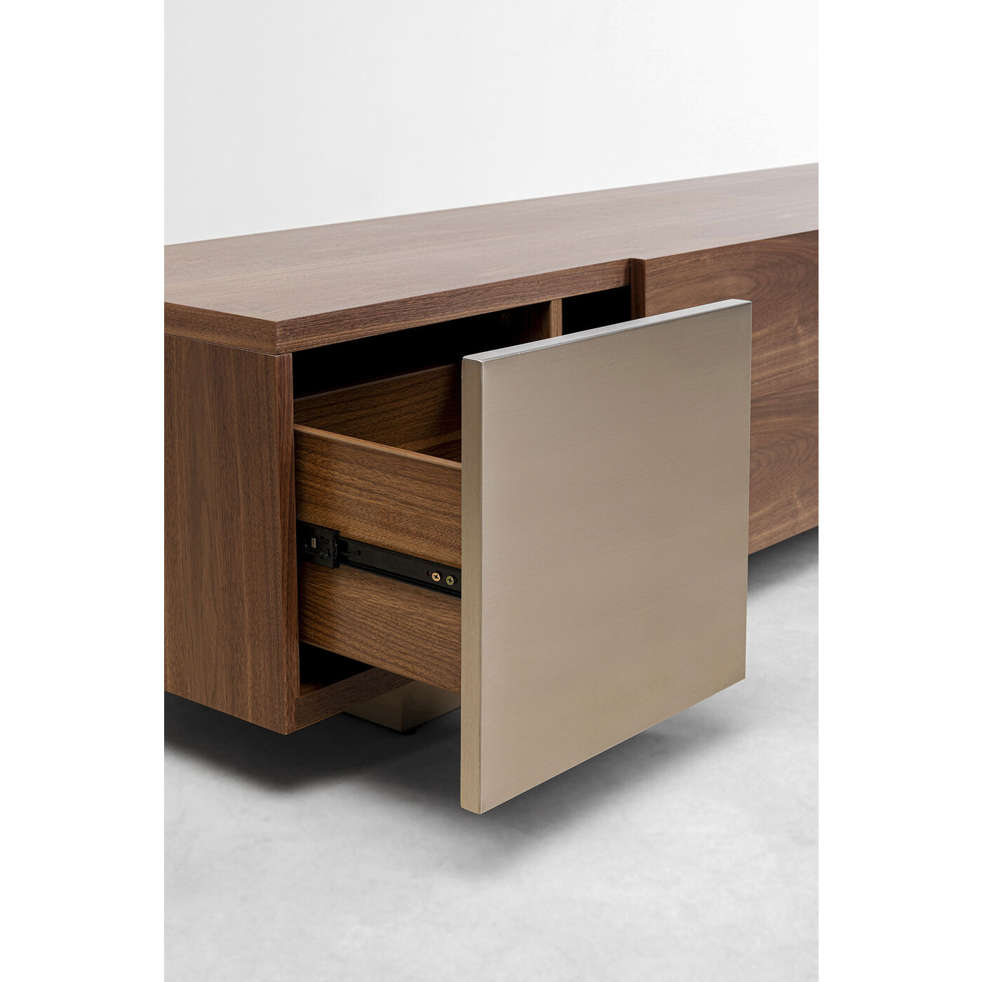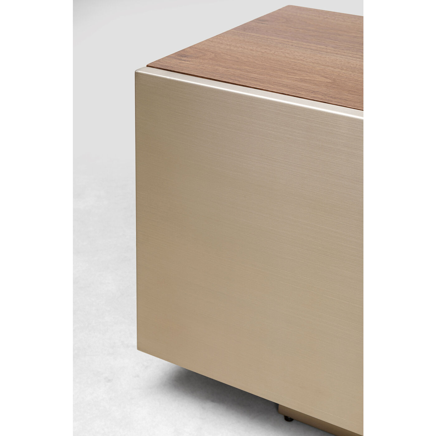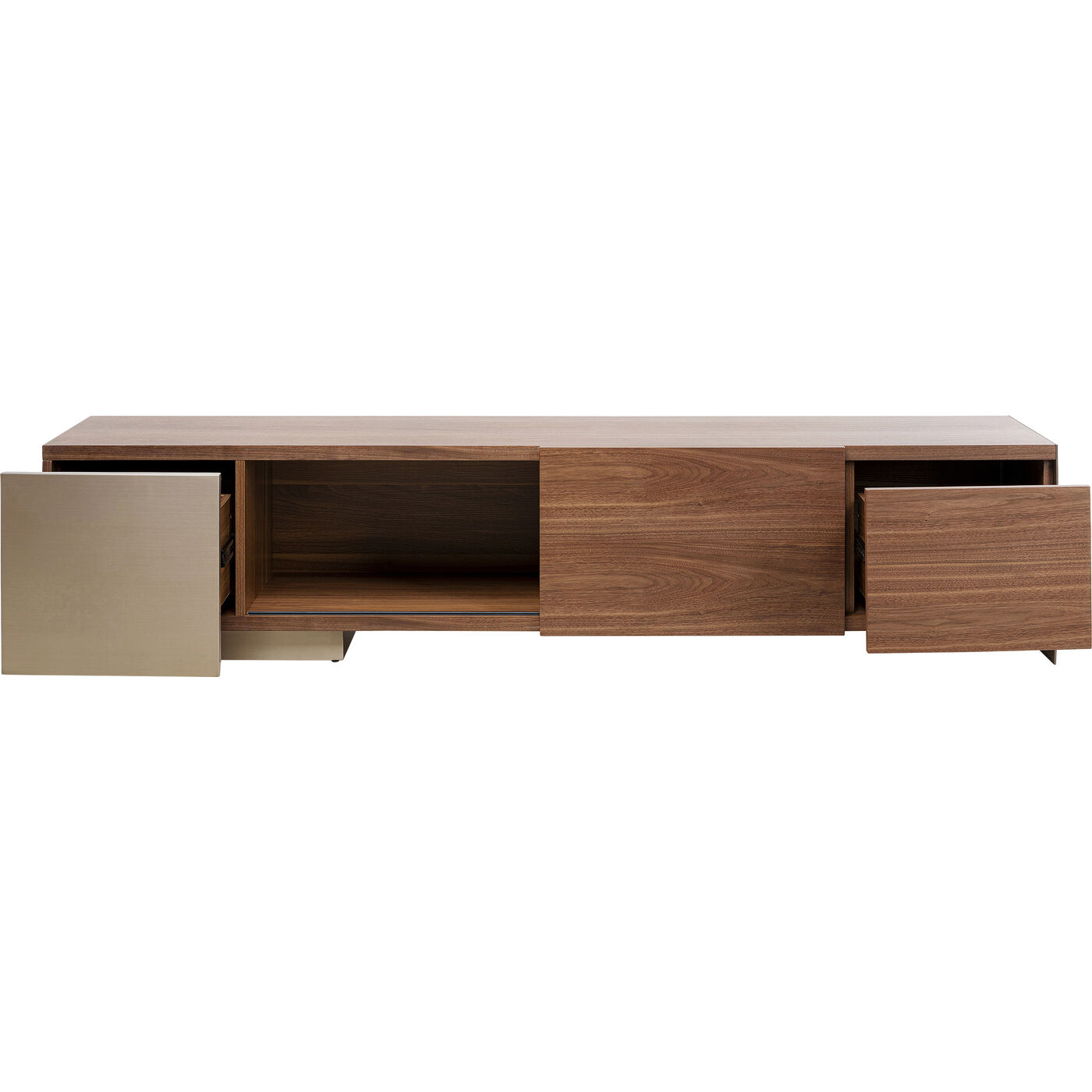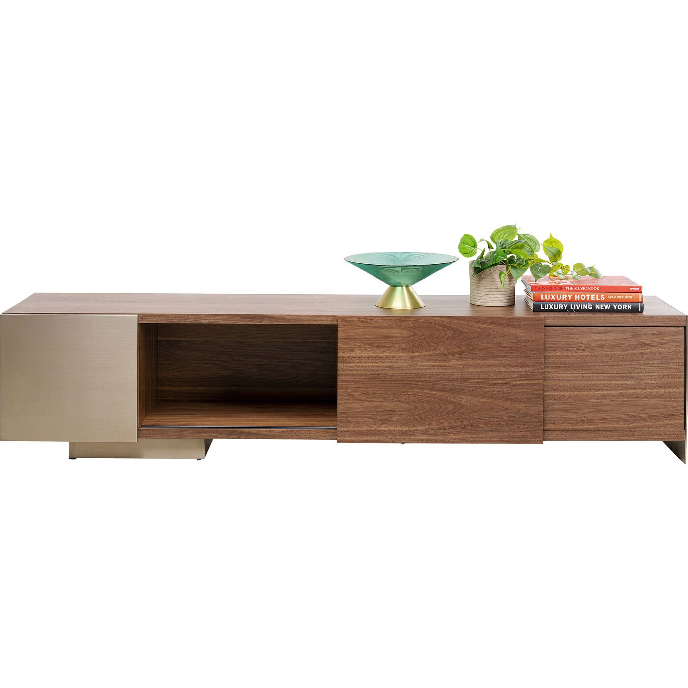 - Das TV-Board ist hochwertig mit vernickeltem Edelstahl, satiniertem Glas und Walnuss-Furnierholz gearbeitet