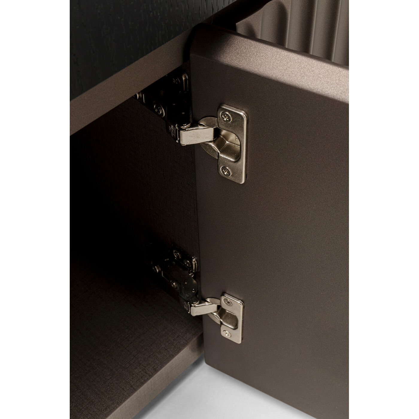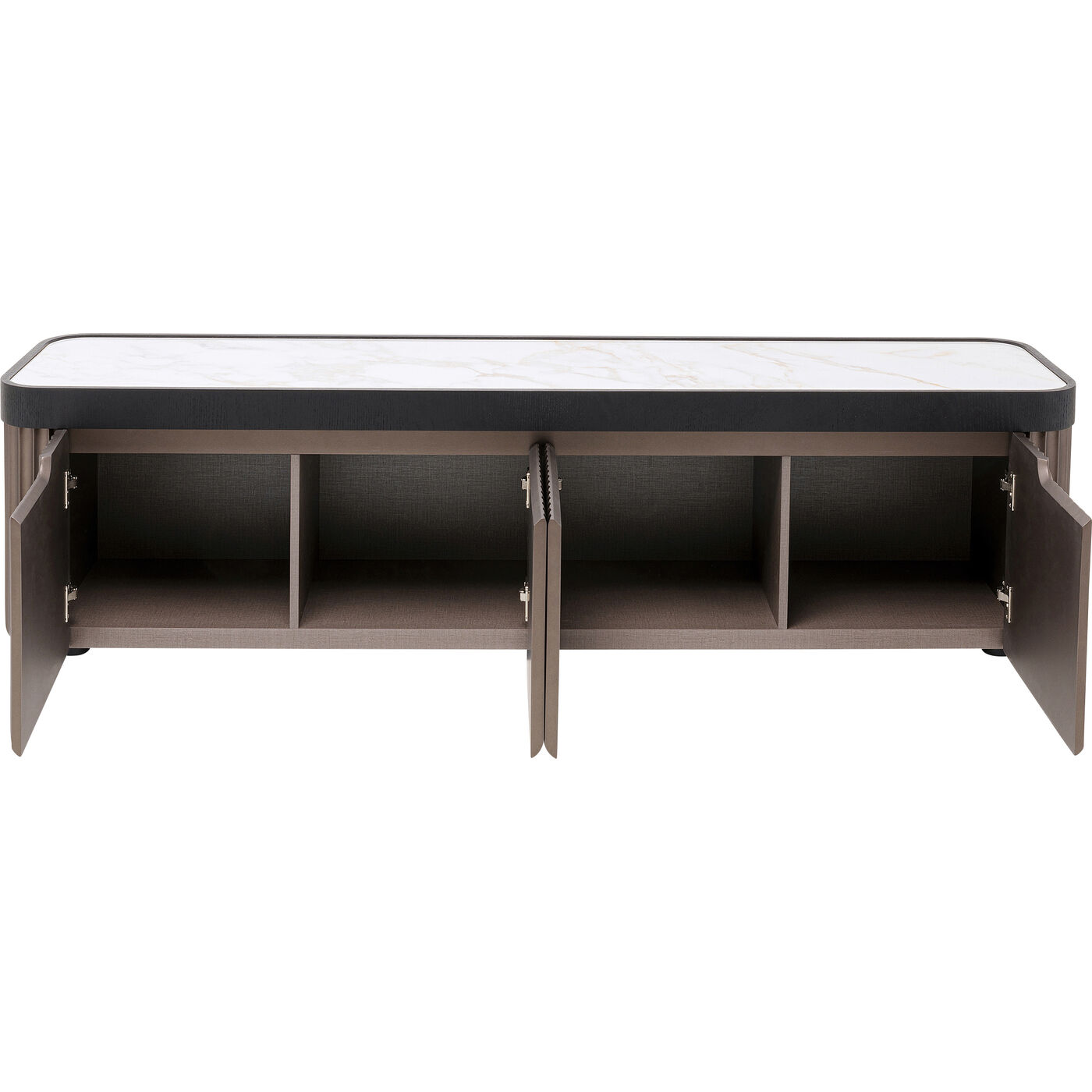 Unser Sideboard aus der Kollektion Phoenix sorgt mit seinem spannenden Materialmix für Überraschungseffekte in Ihrem Wohnzimmer. Die helle Deckplatte wird aus Keramik gefertigt und ist mit einer Lackierung geschützt. Die umlaufende, schwarz lackierte Kante ist aus Eichenholz-Furnier gearbeitet und zeigt sich mit der durchscheinenden Maserung im Zusammenspiel mit der Keramikplatte besonders edel.