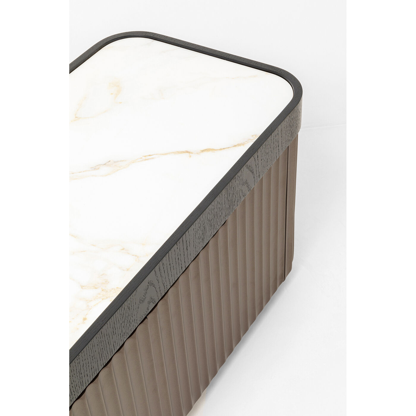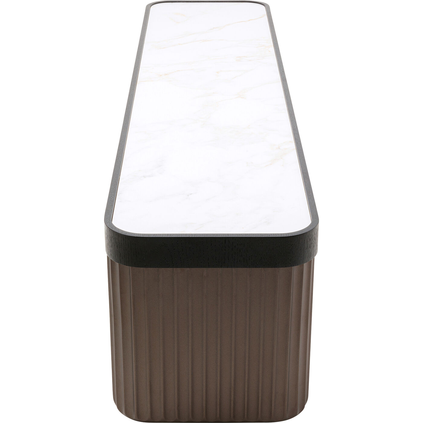 Unser TV-Board aus der Möbel-Kollektion Phoenix sorgt mit seinem spannenden Materialmix für Überraschungseffekte in Ihrem Wohnzimmer. Die helle Deckplatte wird aus Keramik gefertigt und ist mit einer Lackierung geschützt. Die umlaufende, schwarz lackierte Kante ist aus Eichenholz-Furnier gearbeitet und zeigt sich mit der durchscheinenden Maserung im Zusammenspiel mit der Keramikplatte besonders edel.