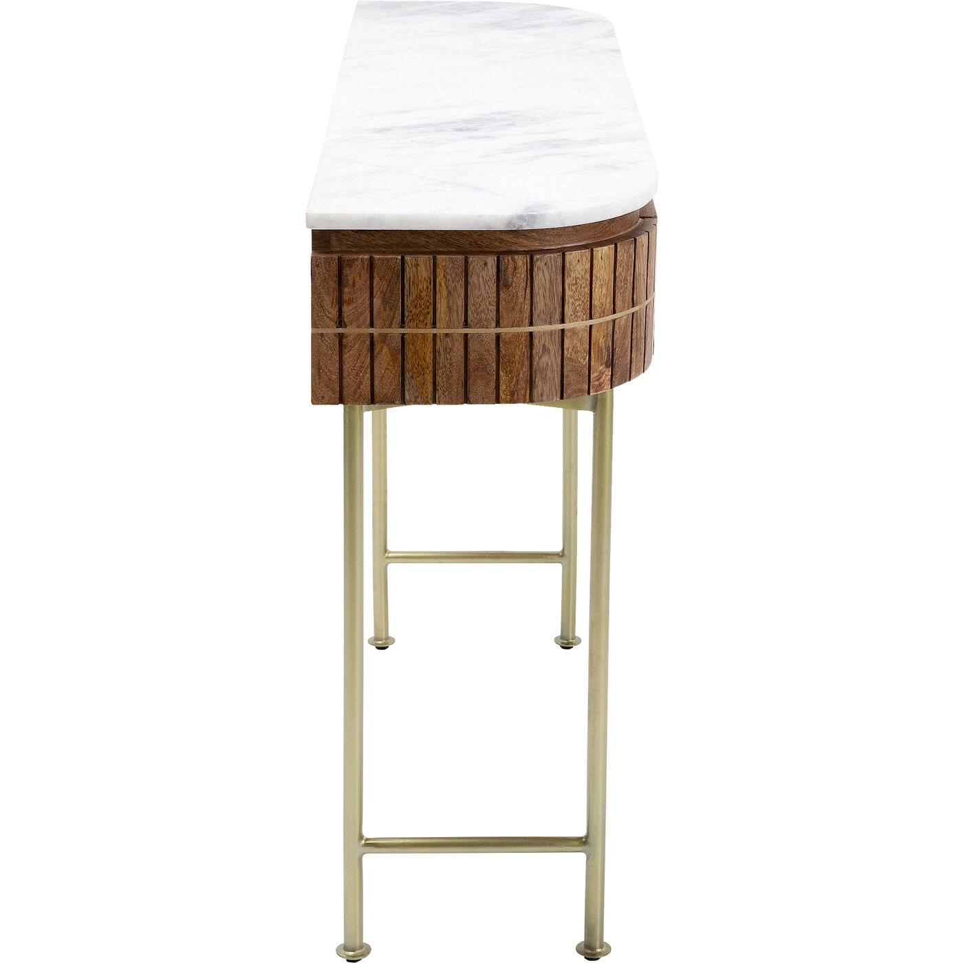 Moderna, sofisticata e con un tocco di lusso: questa consolle porterà la vostra zona giorno a un livello superiore in termini di interior design. La combinazione dei materiali utilizzati è di per sé uno spettacolo. Il tavolo da ingresso in legno di mango massiccio con piano in marmo di alta qualità e gambe dorate è pieno di stile. La forma ovale con modanature decorative su entrambi i lati aggiunge un tocco di unicità. Anche la consolle da parete non è un pezzo unico, grazie alla sua produzione artigianale. La consolle stretta con cassetti è ideale per il corridoio. È anche un ottima toeletta o un tavolino per il bagno (da proteggere dall umidità) o per il soggiorno: un vero e proprio multi-talento!