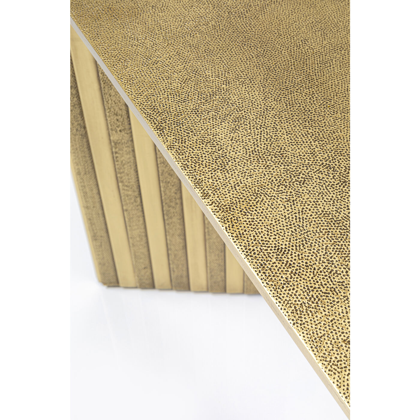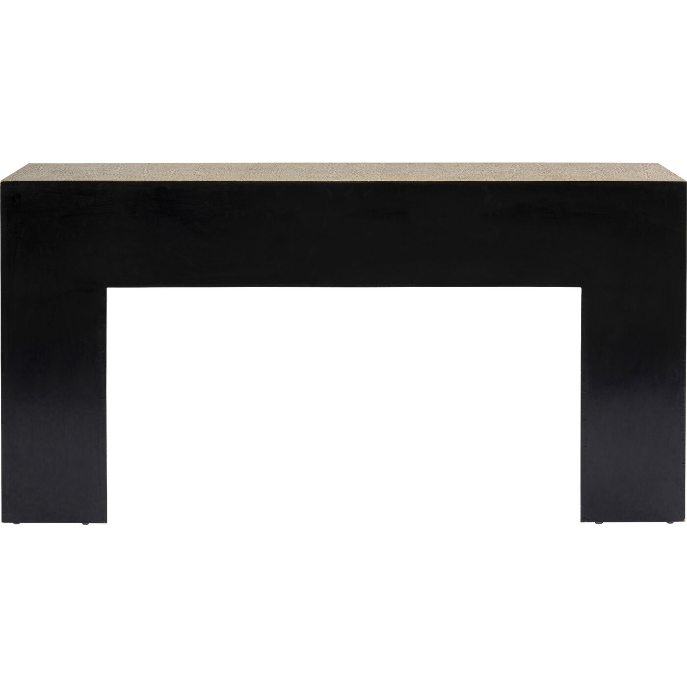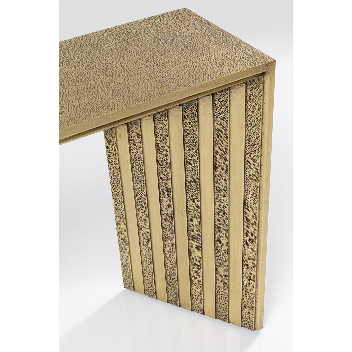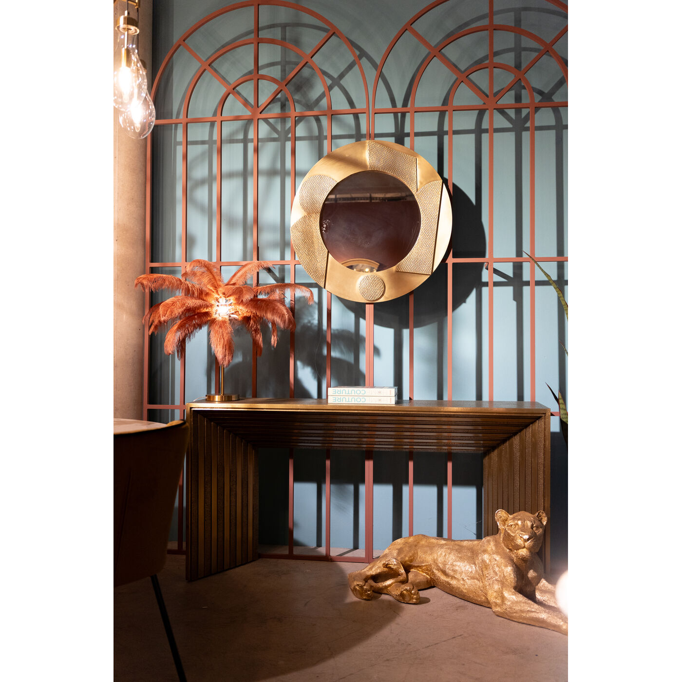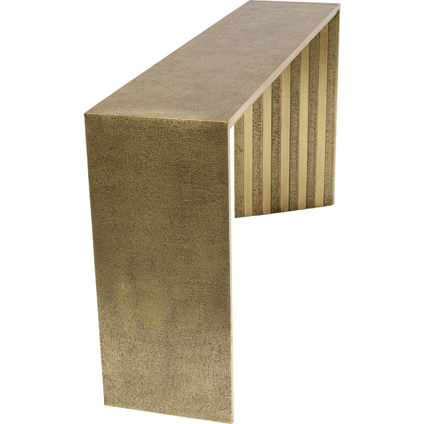 Questa spettacolare console in oro è un vero e proprio richiamo visivo grazie al suo design grafico insolito. Il frontale in metallo parzialmente lavorato a mano (rivestito in ottone) crea effetti visivi sensazionali e conferisce modernità e lusso ai vostri interni. Equipaggiato con bottiglie e bicchieri, lo stretto tavolo diventa un bar della casa con stile.