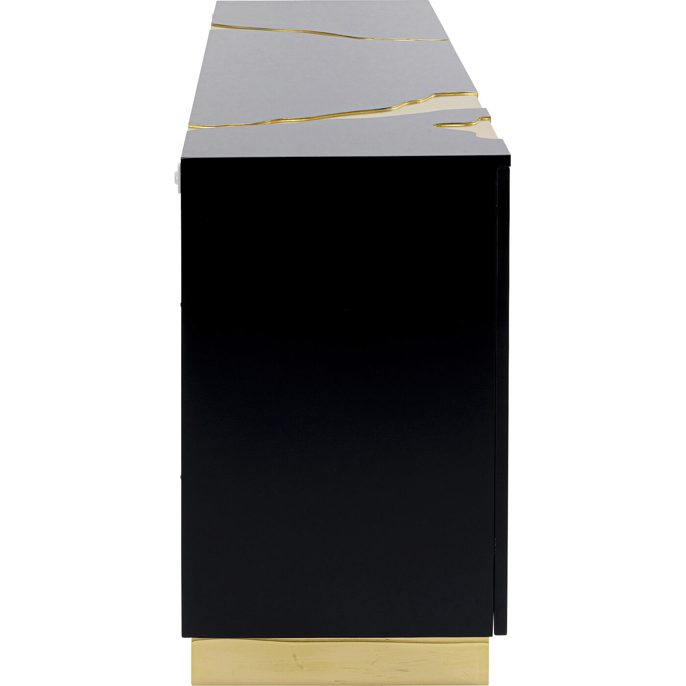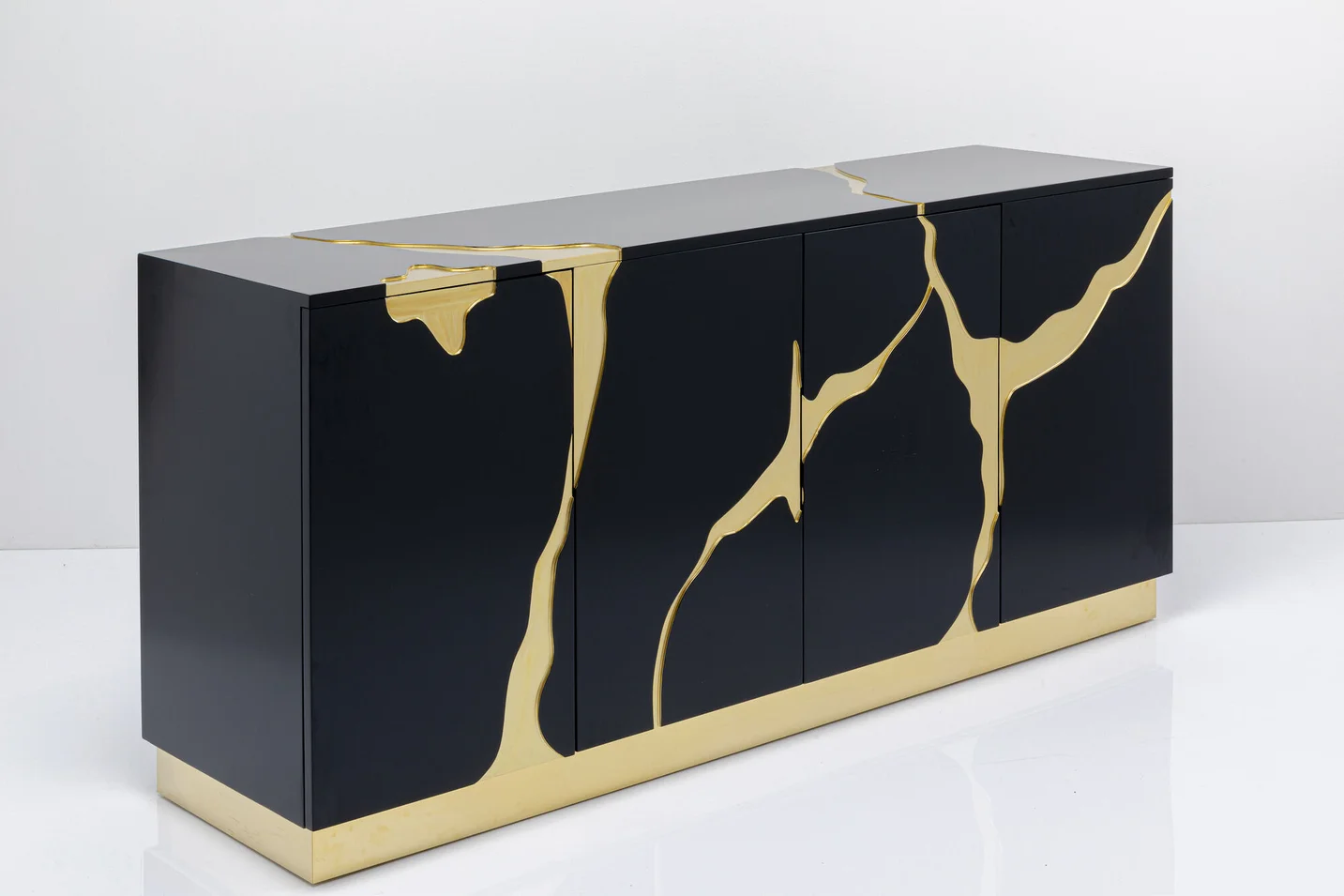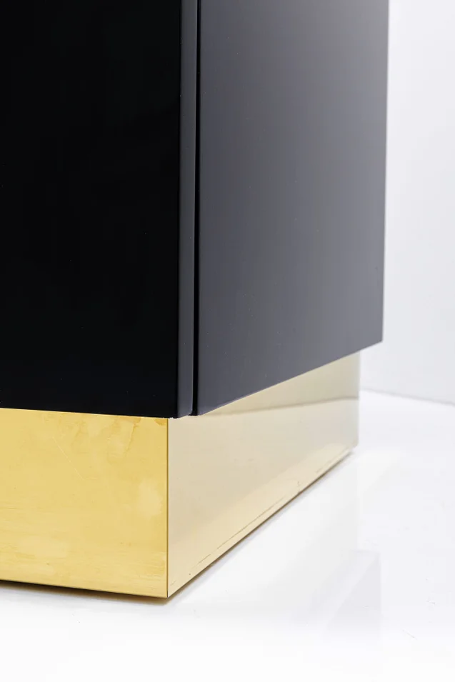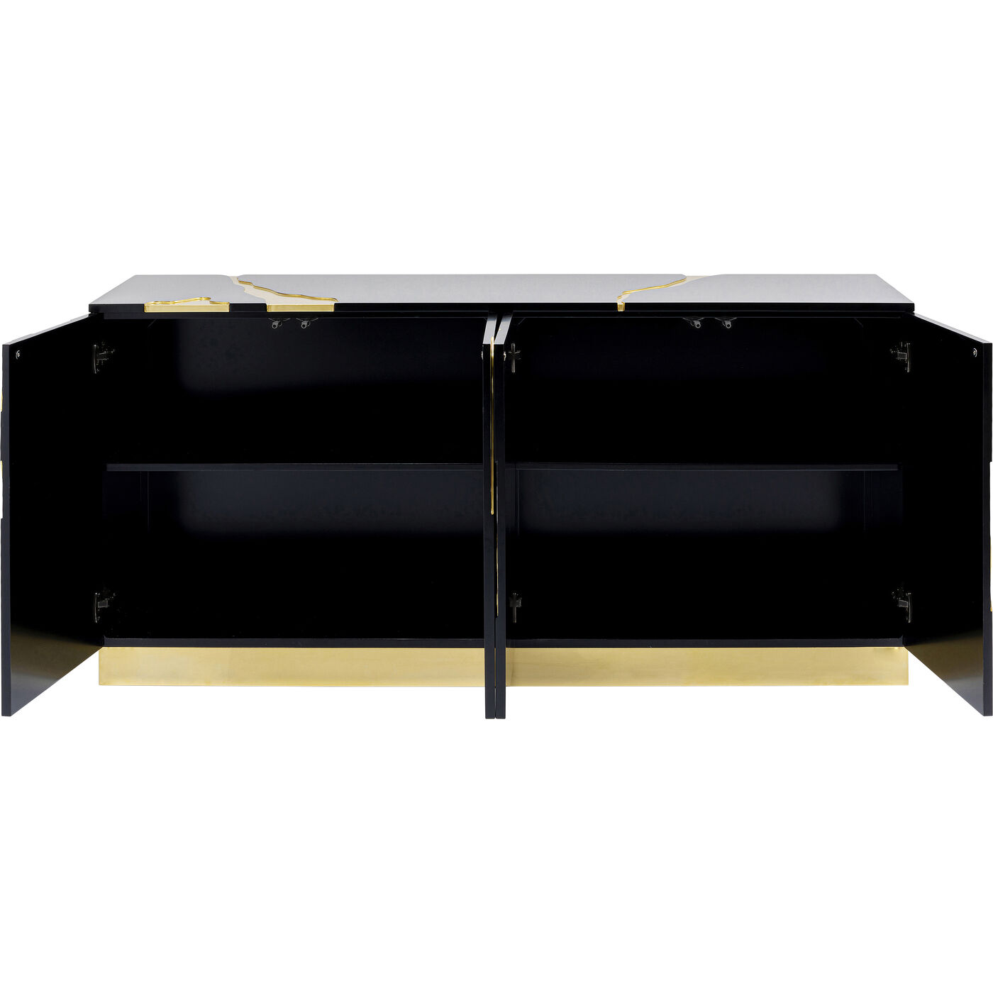 Questa credenza dà un tocco di classe al vostro spazio abitativo! Con il design unico della base e delle linee dorate, dà l impressione che il rivestimento nero sia stato rifinito da un artista dell oggetto. Assolutamente creativo e di grande impatto visivo! La credenza in look lussuoso può essere utilizzata anche come alternativa alla lavagna per la TV e offre spazio sufficiente per riporre gli oggetti grazie ai quattro ripiani regolabili. La pratica funzione push-to-open permette di aprire le ante senza maniglie, mantenendo così l aspetto complessivo della credenza moderno e pulito.