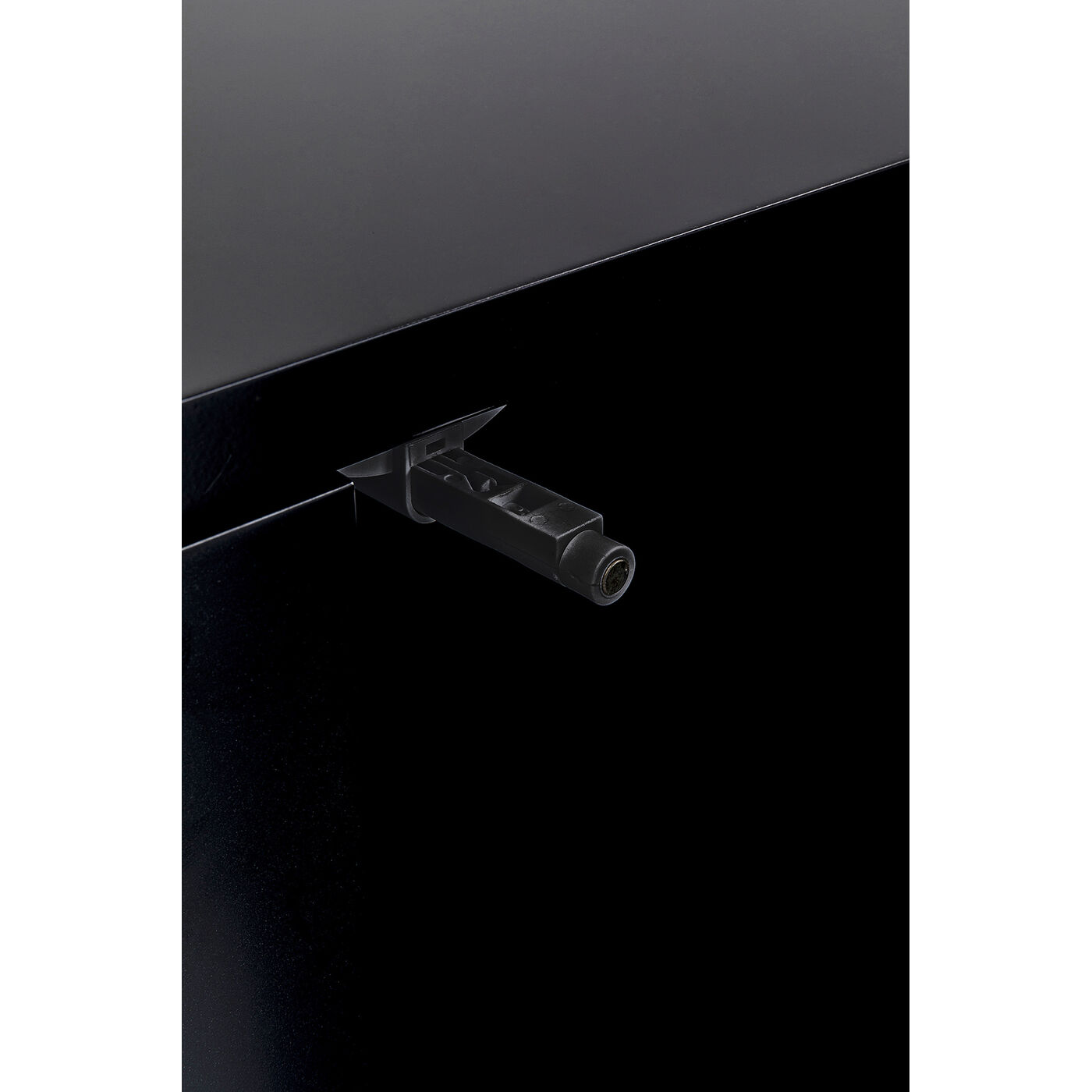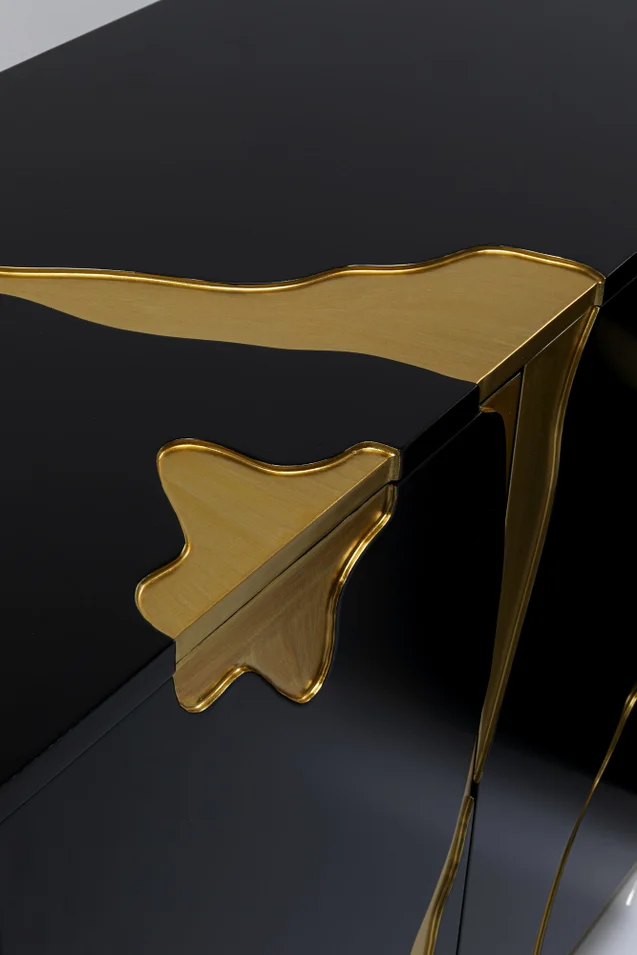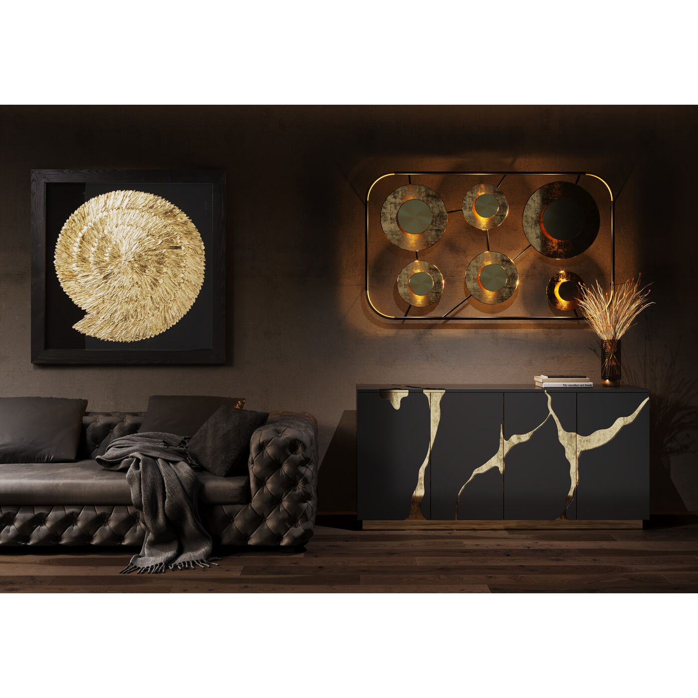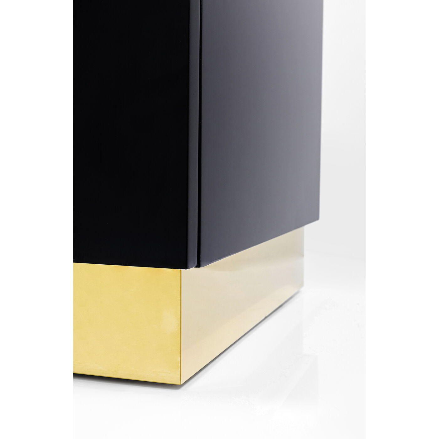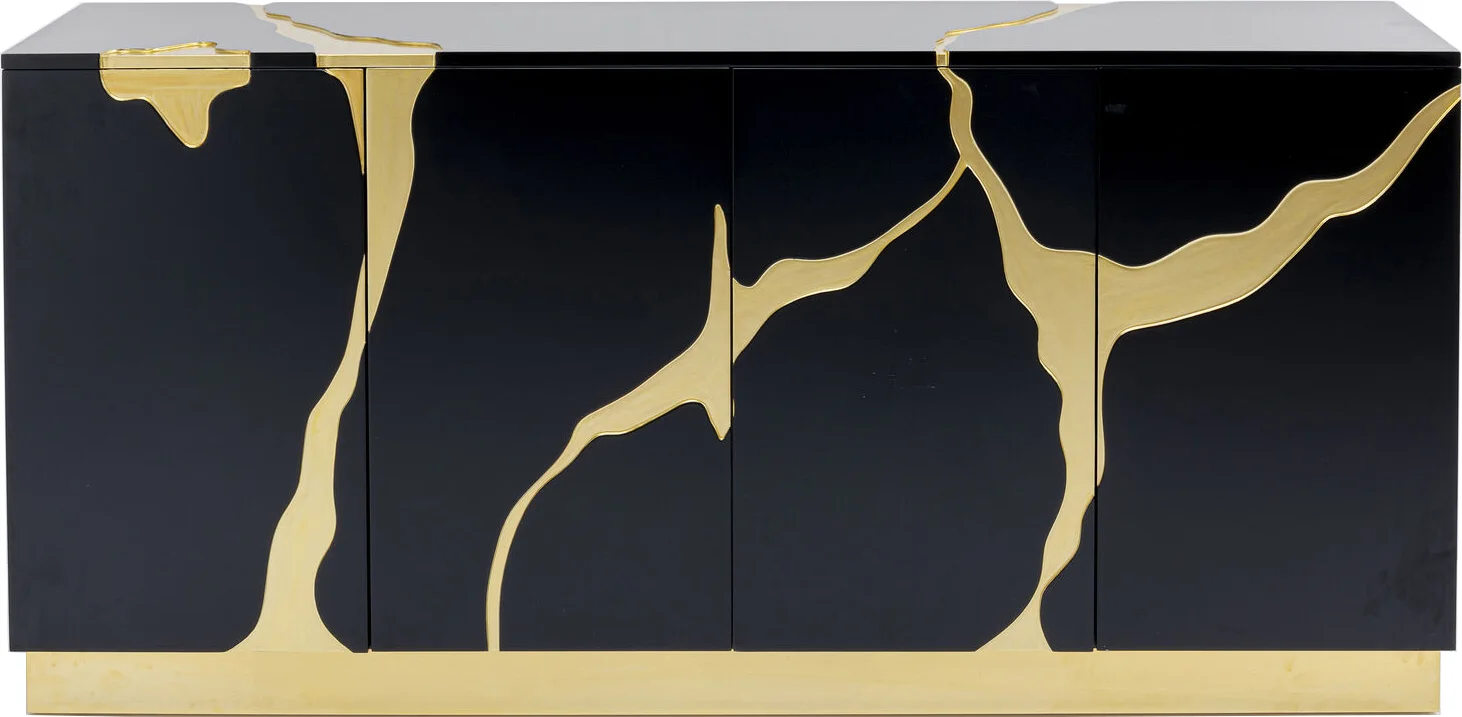 Questa credenza dà un tocco di classe al vostro spazio abitativo! Con il design unico della base e delle linee dorate, dà l impressione che il rivestimento nero sia stato rifinito da un artista dell oggetto. Assolutamente creativo e di grande impatto visivo! La credenza in look lussuoso può essere utilizzata anche come alternativa alla lavagna per la TV e offre spazio sufficiente per riporre gli oggetti grazie ai quattro ripiani regolabili. La pratica funzione push-to-open permette di aprire le ante senza maniglie, mantenendo così l aspetto complessivo della credenza moderno e pulito.