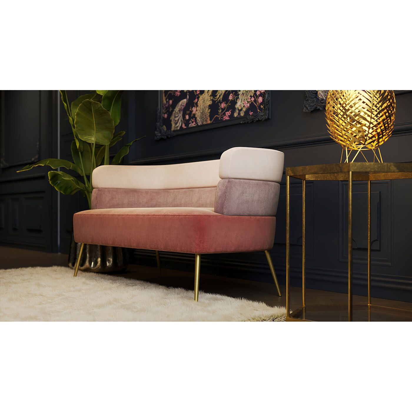 Il delicato divano sandwich in velluto in tre armoniose tonalità di rosa convince con le sue curve armoniose, le dimensioni delicate e il design speciale.
