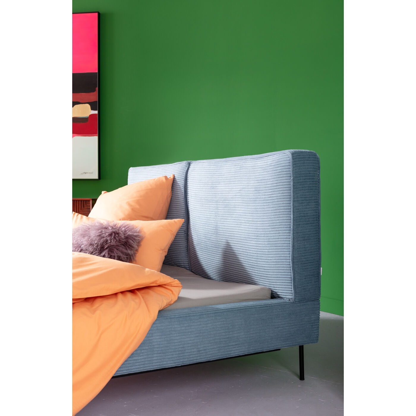 - L ampio velluto a coste come tessuto di rivestimento rende questo letto matrimoniale un esperienza tattile e visiva.
