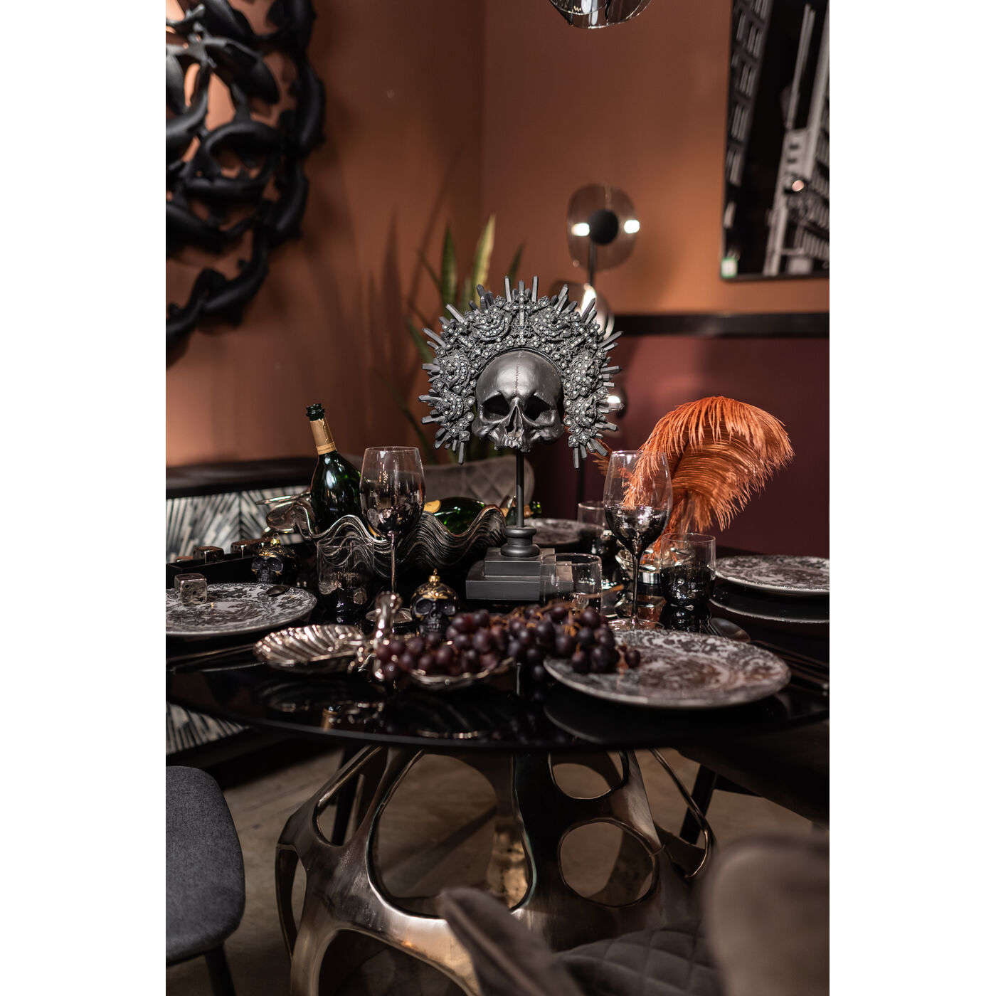 Ispirato dall'artista Damien Hirst: la sua scultura del teschio è stata una delle opere d'arte più costose del nostro tempo. Questo oggetto decorativo varia il tema in stile antico e sembra un reperto del mercato delle pulci - coronato da un copricapo reale.