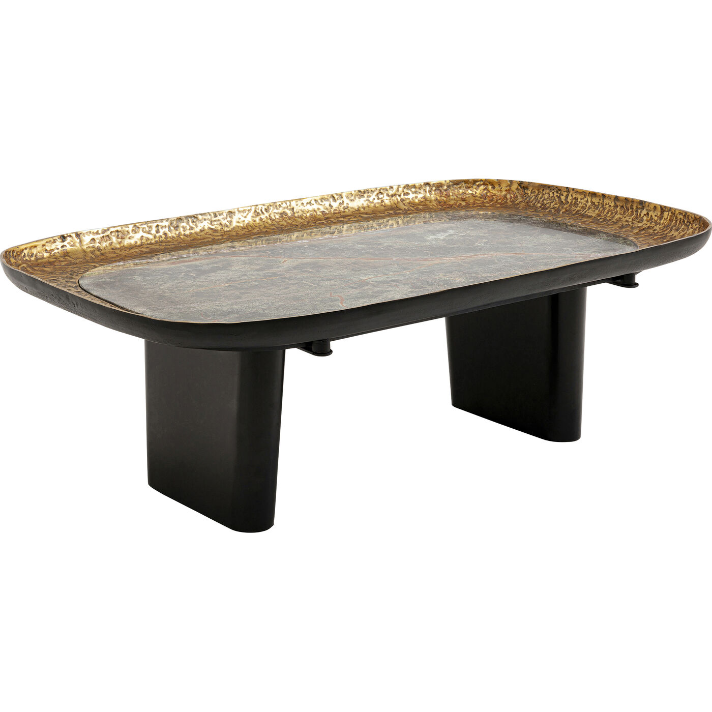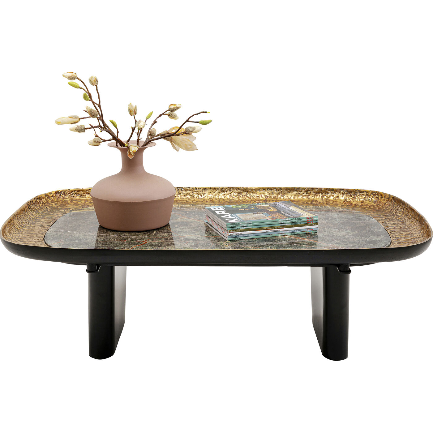 Der schwarz-goldfarbene Couchtisch gehört eigentlich in ein Designmuseum und repräsentiert ein Stück echter Handwerkskunst. Wäre er mit seiner großen Abstellfläche nicht auch noch sehr funktional, dann könnte er gut als Kunstobjekt angesehen werden. Jedes Arrangement mit Coffeetable Books, Dekoobjekten oder Blumen gerät auf dem edlen Material zum ästhetischen Mittelpunkt Ihres Wohnzimmers. Für Wohnlandschaften und Sofas wird dieser Marmor-Couchtisch mit Sicherheit zum krönenden, optischen Abschluss.