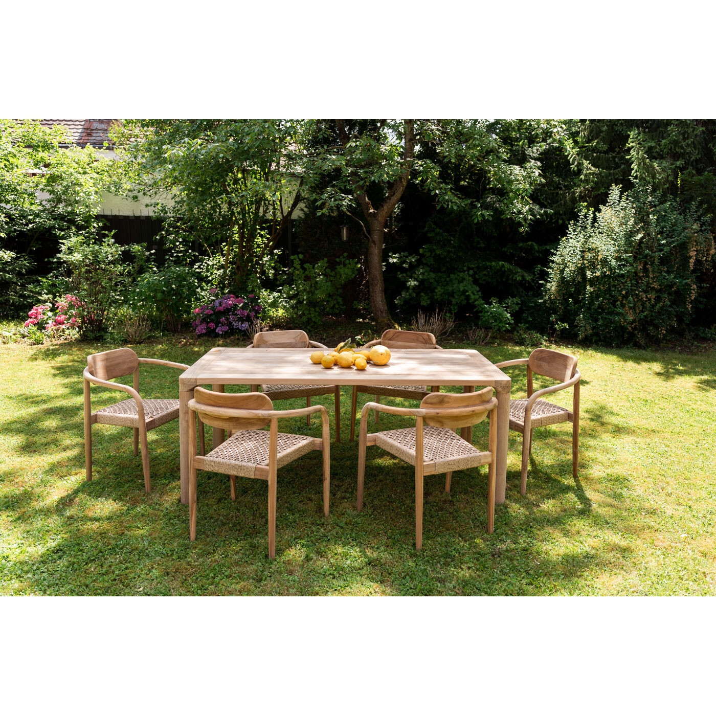 Questo elegante tavolo da pranzo per esterni in teak porta una ventata di aria fresca in qualsiasi spazio esterno! La superficie robusta e oliata lo rende il compagno ideale per patii, balconi e giardini, con qualsiasi tempo. Grazie al suo design senza tempo, il tavolo può essere abbinato a un ampia varietà di sedie e accessori, sia in stile moderno e minimalista che in stile rustico e country. Che si tratti di cene accoglienti, feste vivaci o ore di relax con amici e familiari, il tavolo crea sempre un atmosfera calda e invitante e assicura momenti indimenticabili all aperto.