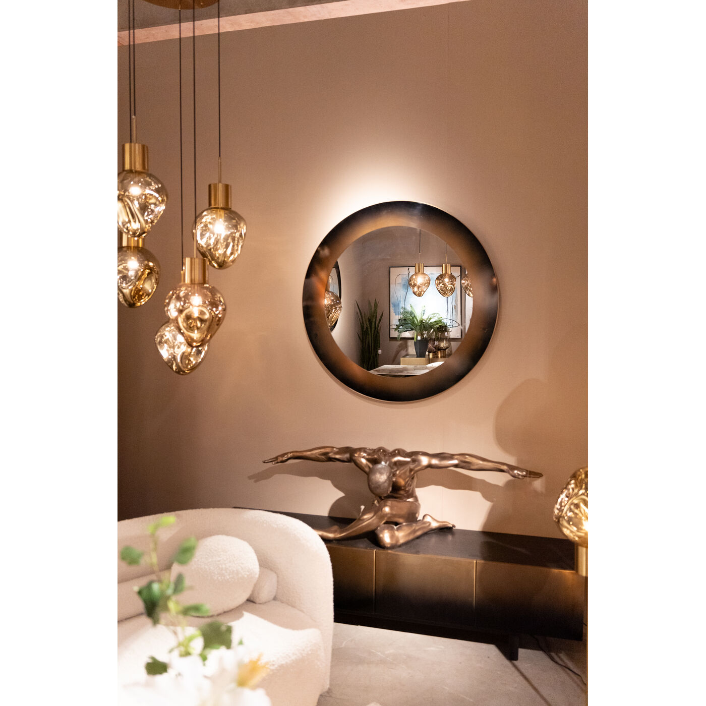 Il grande specchio rotondo con cornice in acciaio inossidabile bordata in oro opaco incarna un eleganza senza tempo e una raffinata maestria artigianale. Il suo formato generoso crea un ampiezza visiva e amplia l ambiente. L acciaio inossidabile di alta qualità garantisce durata e resistenza. La sottile tinta oro conferisce allo specchio un tocco delicato e lussuoso. Un pezzo forte per interni esclusivi che unisce funzionalità e fascino estetico.
