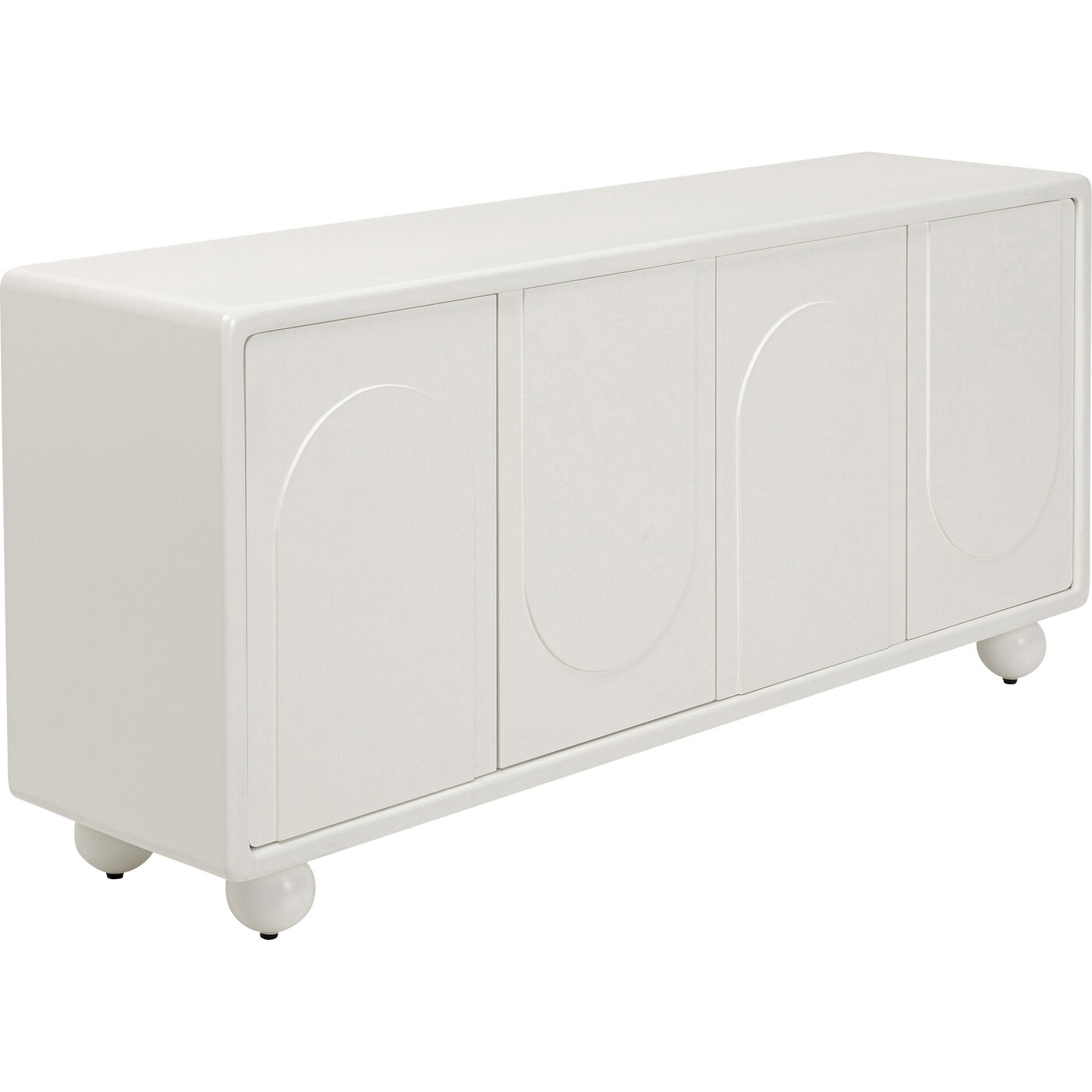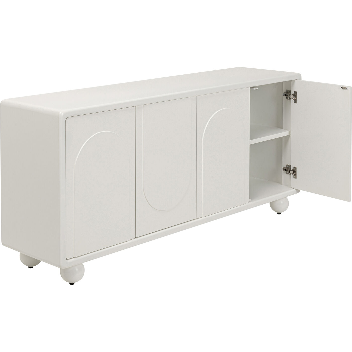- Außergewöhnlich wird dieses weiße Wohnzimmer-Board durch das dezente Dekor mit Rundbögen auf den Fronten