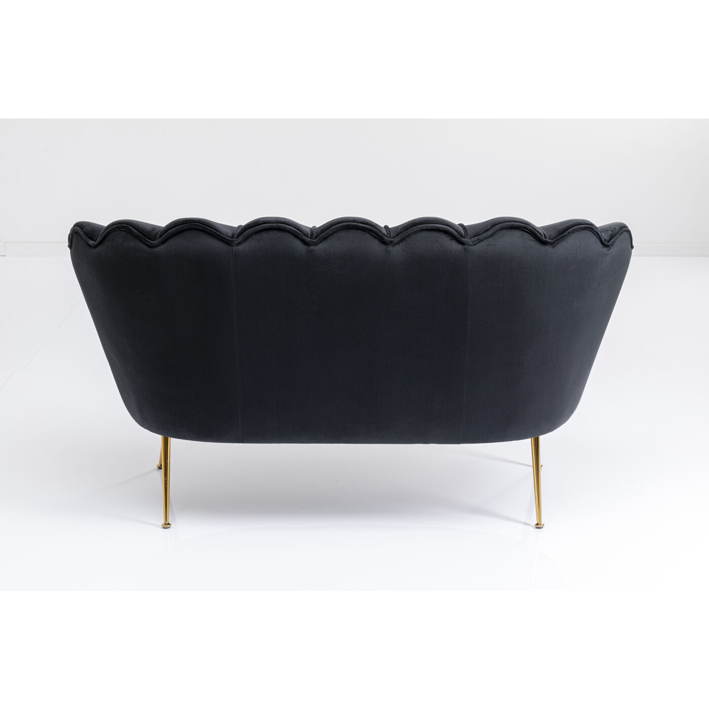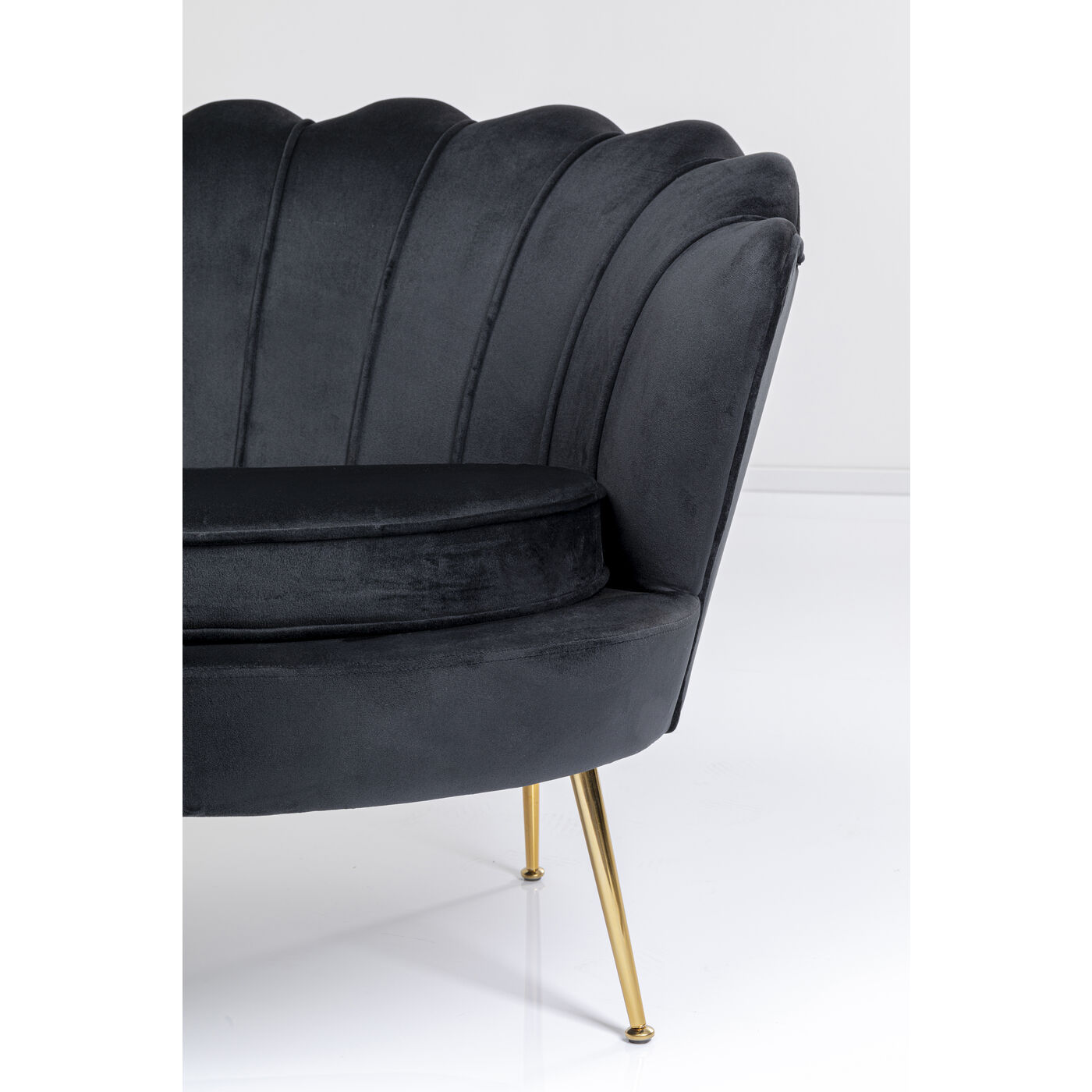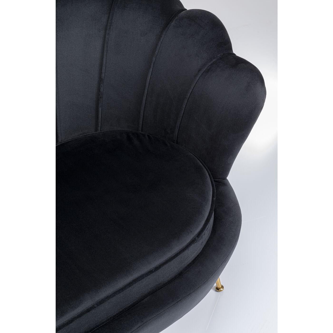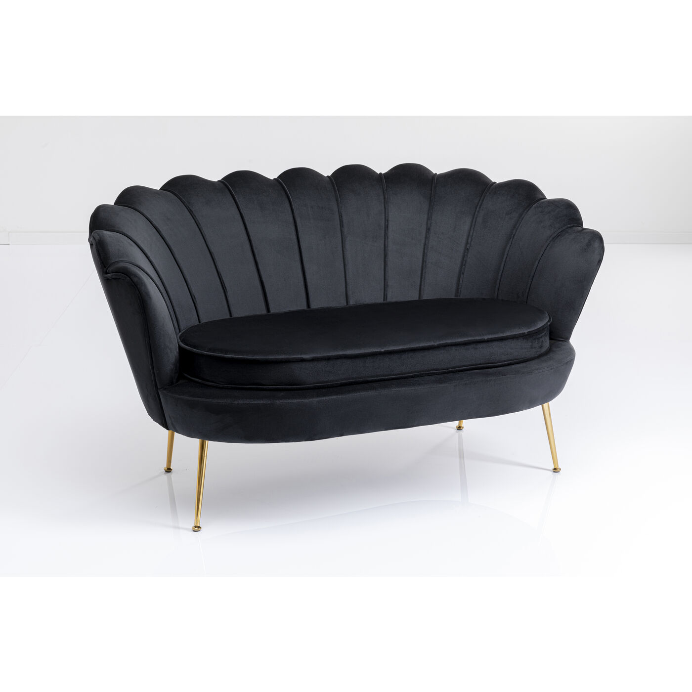 Mit diesem kleinen Samt-Sofa sind Sie definitiv der Main Character! Damit verwandeln Sie Ihr Wohnzimmer im Nu in einen stylischen Salon. Dank ihrer Maße bringt die Couch spielend leicht Stil und Charme auch in ein Ein-Zimmer-Appartement. Der in Schwarz schimmernde Zweisitzer in Blütenform sieht dabei nicht nur blendend aus, er ist dank der runden, gebogenen Arm- und Rückenlehne und dem losen Sitzpolster auch besonders gemütlich. Das Schwarz setzt ein Farbstatement in Ihrem Wohnzimmer und lässt sich super mit knalligen Farben wie türkis oder pink, aber auch mit hellen, erdigen Farben kombinieren. Perfekt in Kombination mit einem passenden Cocktail-Sessel – besonders wenn kein Platz für eine große Eck-Couch da ist.