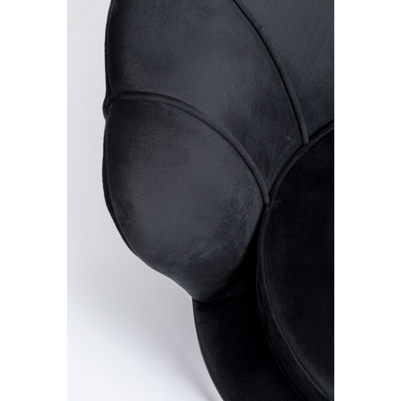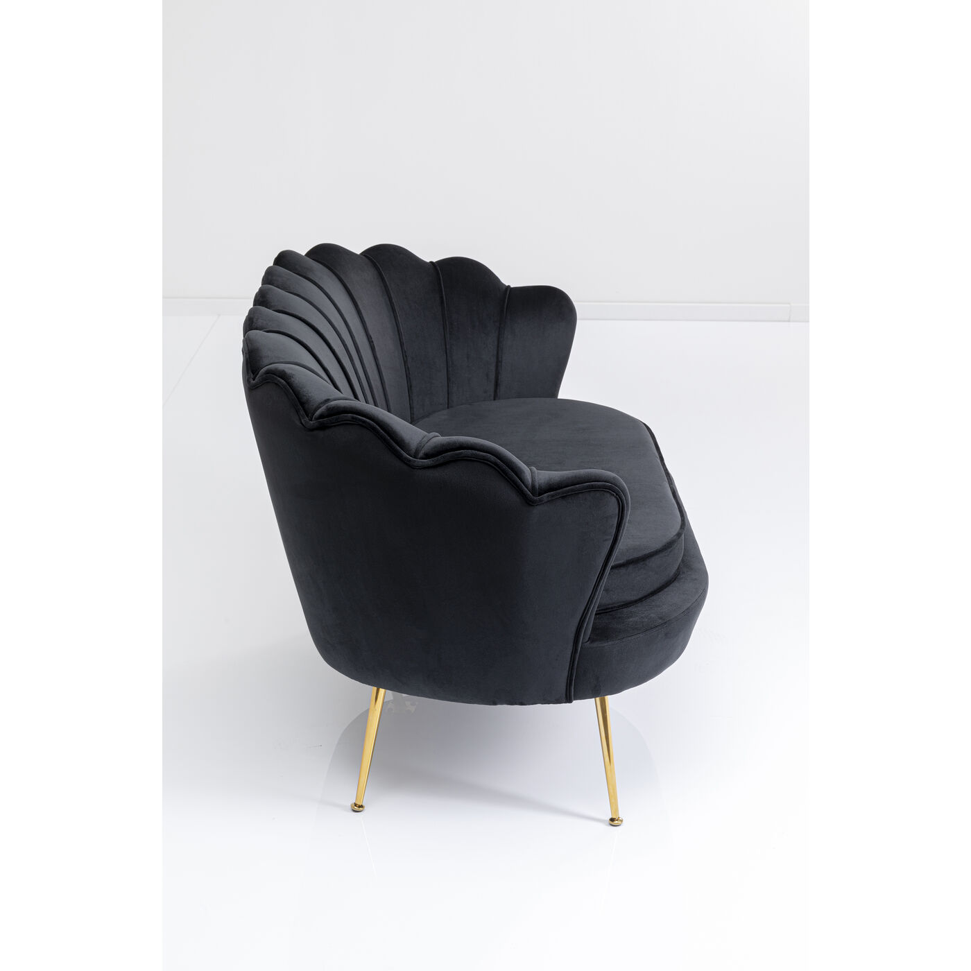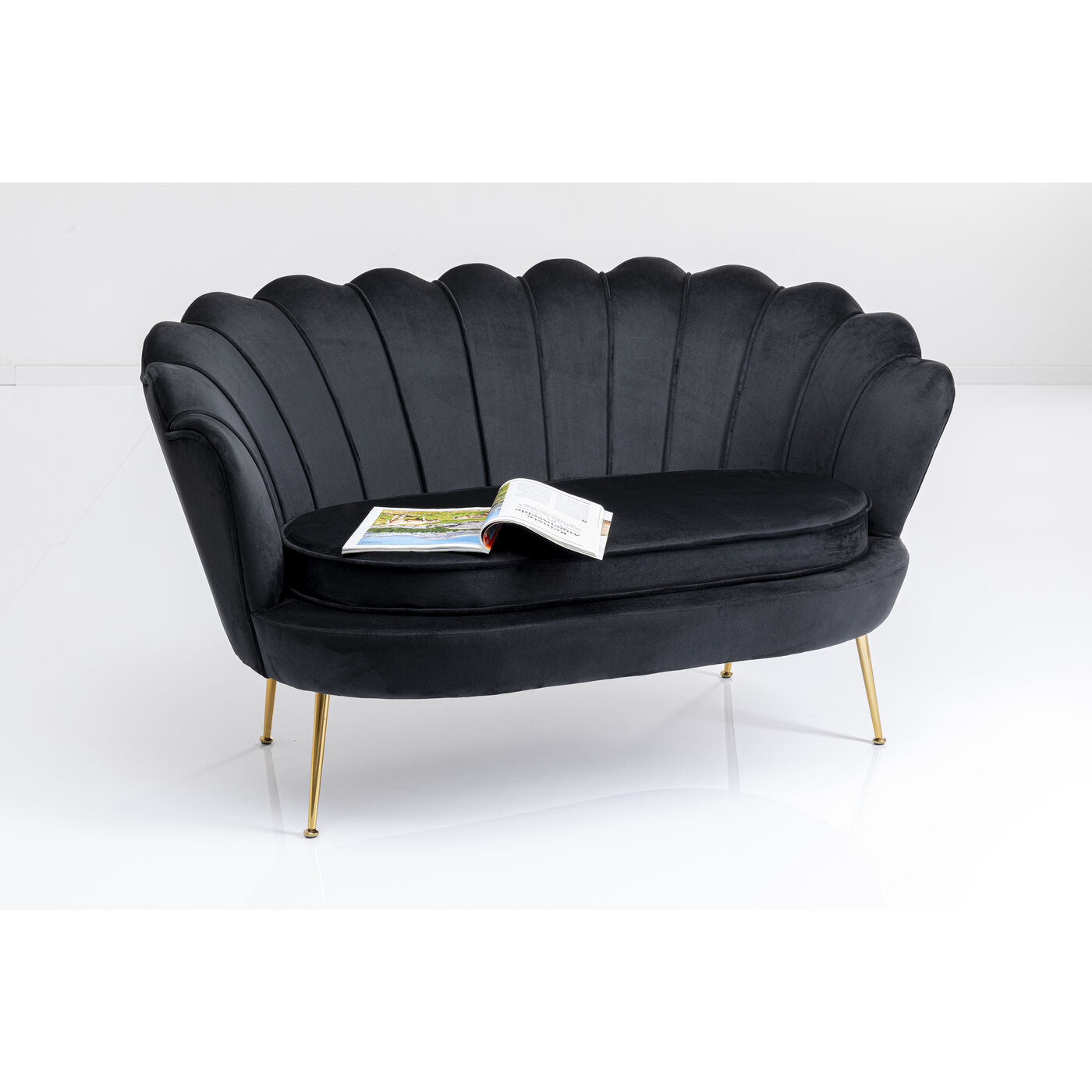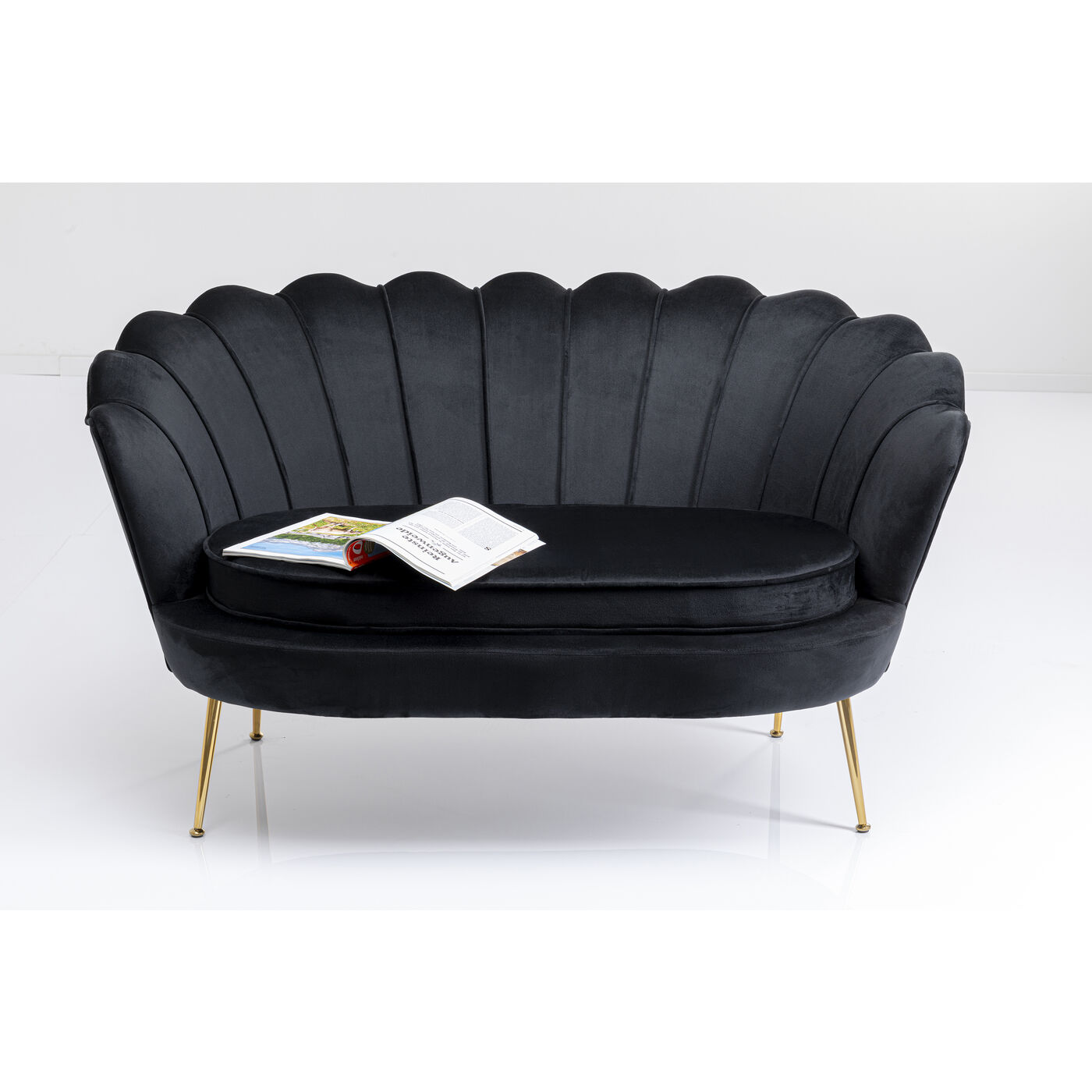 Mit diesem kleinen Samt-Sofa sind Sie definitiv der Main Character! Damit verwandeln Sie Ihr Wohnzimmer im Nu in einen stylischen Salon. Dank ihrer Maße bringt die Couch spielend leicht Stil und Charme auch in ein Ein-Zimmer-Appartement. Der in Schwarz schimmernde Zweisitzer in Blütenform sieht dabei nicht nur blendend aus, er ist dank der runden, gebogenen Arm- und Rückenlehne und dem losen Sitzpolster auch besonders gemütlich. Das Schwarz setzt ein Farbstatement in Ihrem Wohnzimmer und lässt sich super mit knalligen Farben wie türkis oder pink, aber auch mit hellen, erdigen Farben kombinieren. Perfekt in Kombination mit einem passenden Cocktail-Sessel – besonders wenn kein Platz für eine große Eck-Couch da ist.