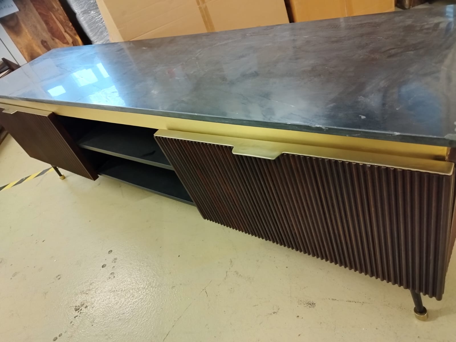 So ein Schmuckstück von einem Lowboard hat nicht jeder: Das niedrige Stauraum-Möbel zeigt sich von außen und von innen gut strukturiert. Die zwei Türen und eine Klappe mit versteckten Griffmulden sind mit massivem Mangoholz in Riffeloptik verkleidet. Dahinter sind Ihre Filmsammlung oder Deko-Objekte bestens aufgehoben. Die Krönung ist jedoch die Deckplatte aus Marmor (Mineralmarmor). Ob hier Ihr Fernseher Platz findet oder Ihre wertvollsten Deko-Objekte, ist ganz Ihrem guten Geschmack überlassen.
